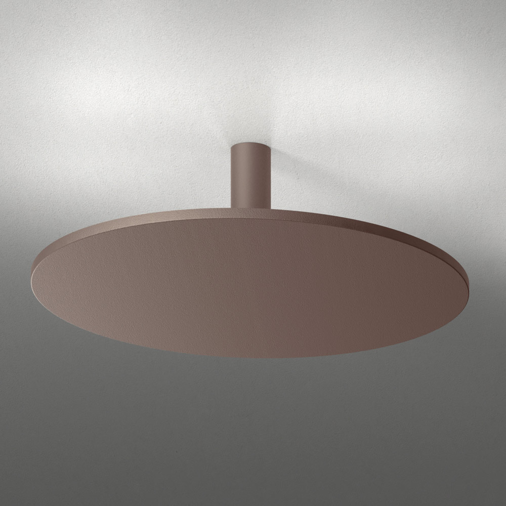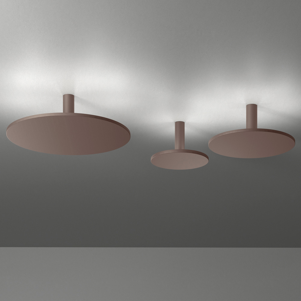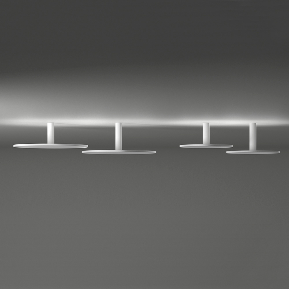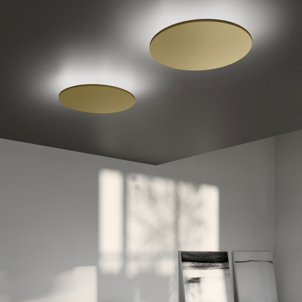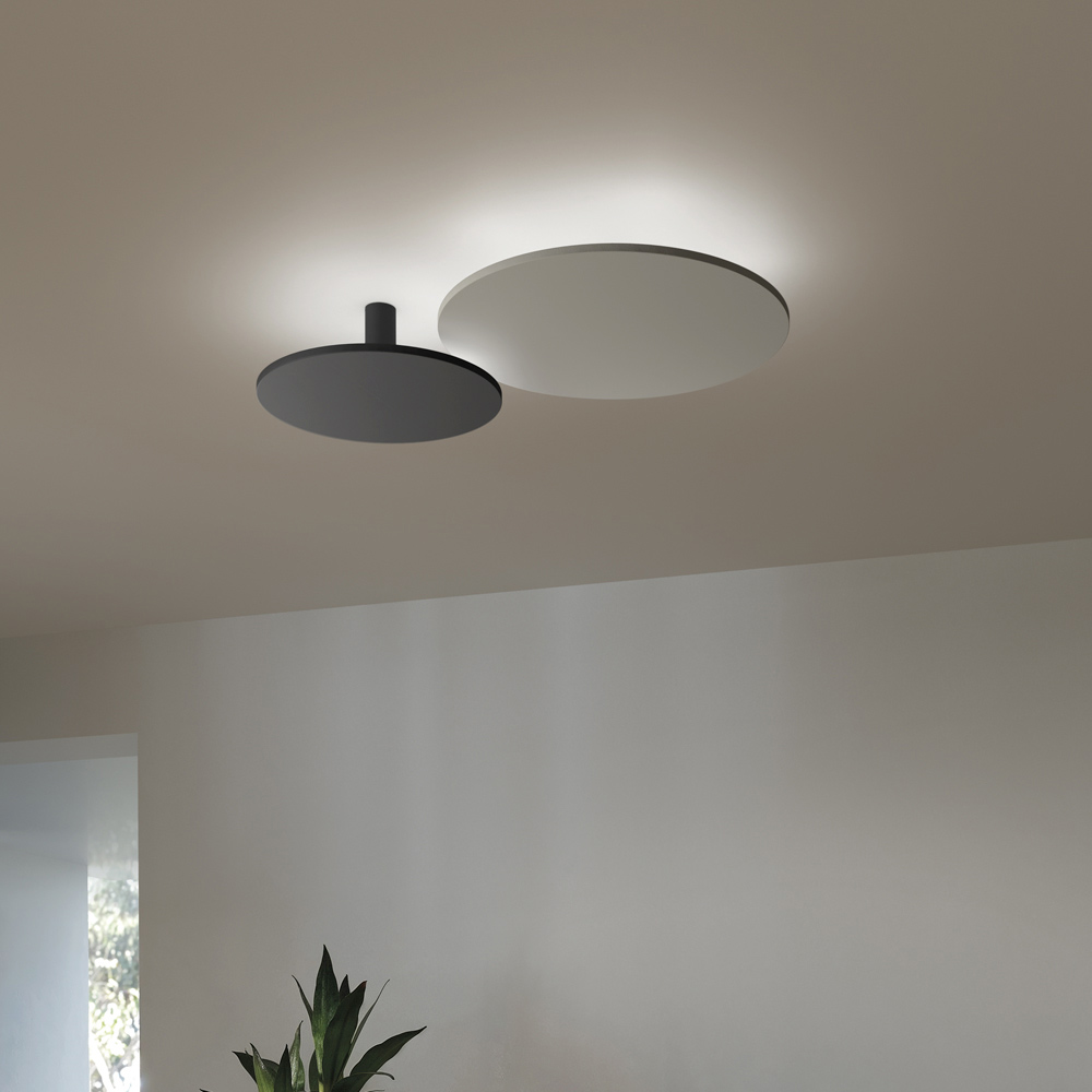 Denna taklampa är ett raffinerat exempel på modern design , där geometri och ljus blandas för att skapa en subtil men ändå effektfull scenografisk effekt. Möjligheten att skapa kompositioner av överlappande skivor , med olika storlekar och ytbehandlingar, genererar ett indirekt, diffust ljus som förhöjer miljön med elegans och visuell harmoni .