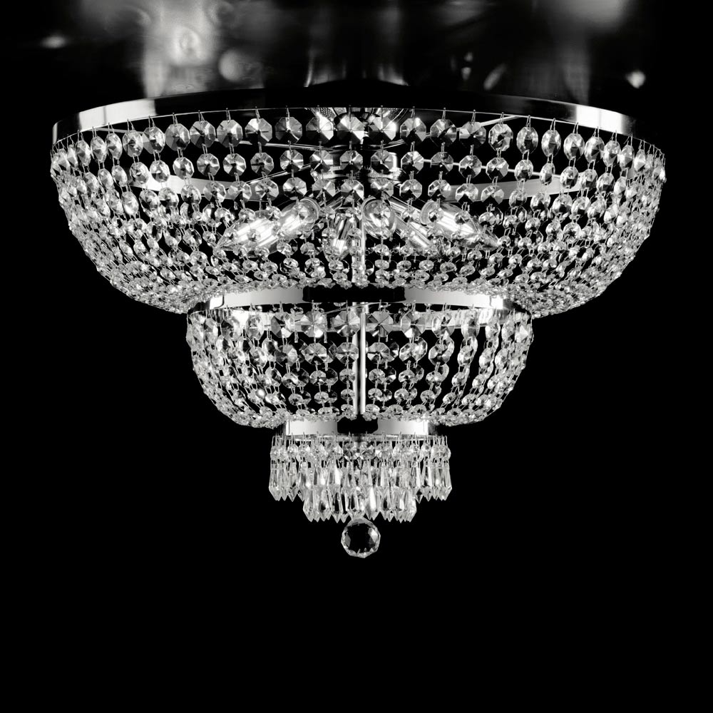 Denna lyxiga taklampa i järn och mässing med strass är elegant och dramatisk, en slående dekorativ skapelse, utformad för att belysa exklusiva utrymmen med förfining. Banden av lysande strass , expertmässigt arrangerade på flera nivåer, skapar ett fängslande spel av reflektioner som förstärker ljuset och ger utrymmet en varm, värdefull och omslutande atmosfär.