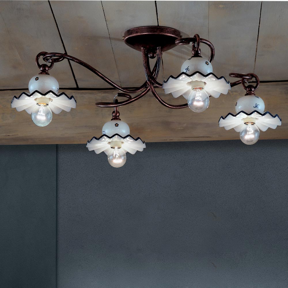 Handgjord taklampa med 3 eller 4 lampor i metall och handmålad keramik tillverkad i Italien av Ferroluce.