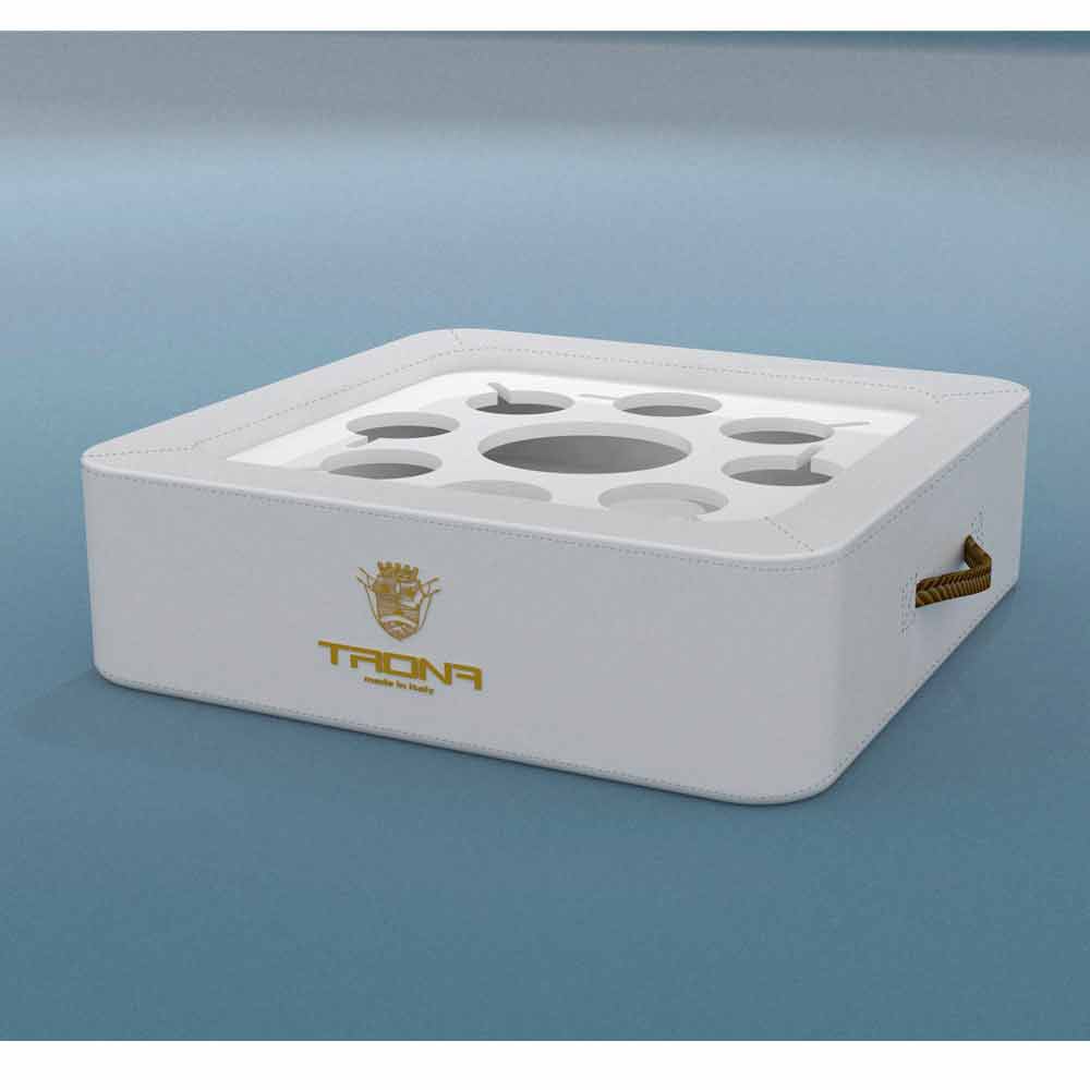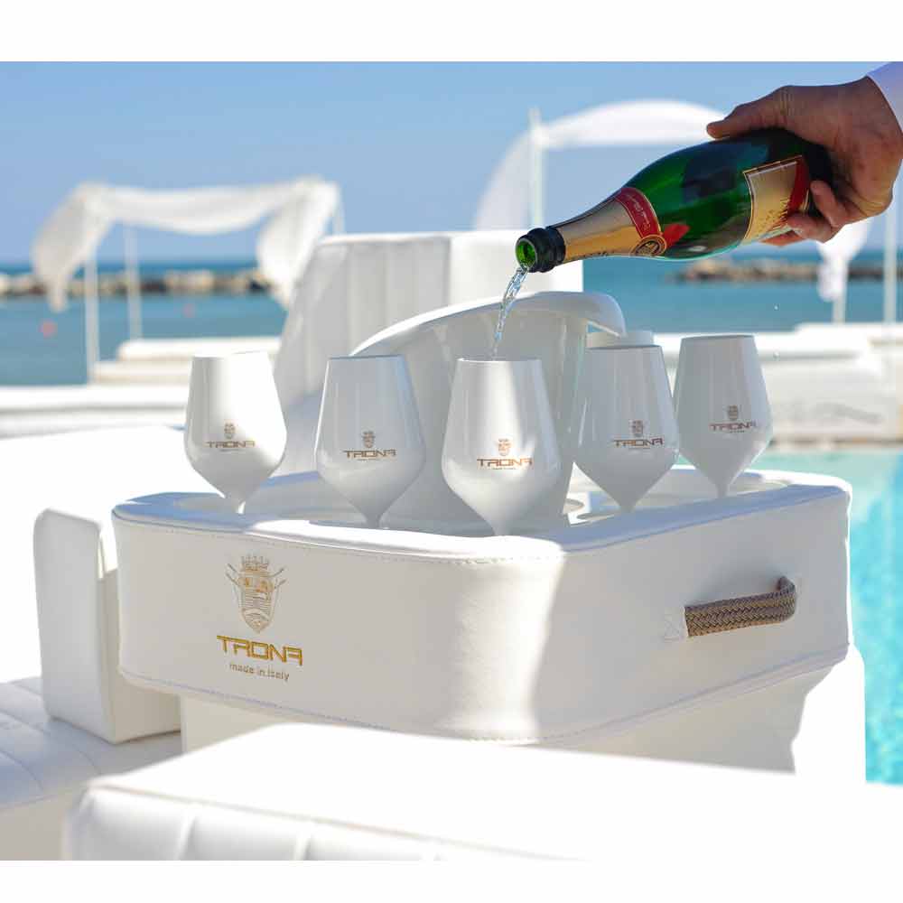 Den speciella platta perforerade plexiglas hävdar Trona flaska, ishink och glas på ett säkert sätt, utan risk för kantring. Trona i själva verket har ett centralt hål som portaghiaccio / flaskhållare och 8 hål lämpliga att ta vin glasögon eller cocktail.