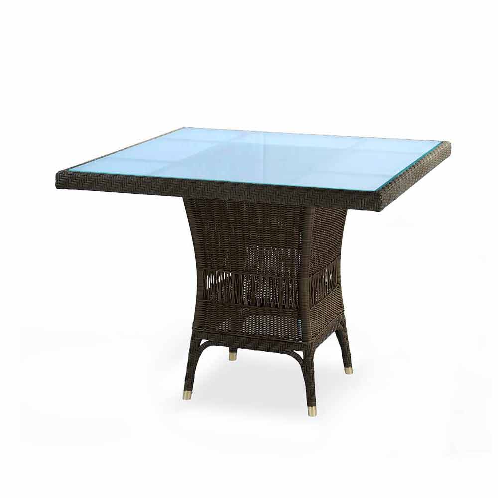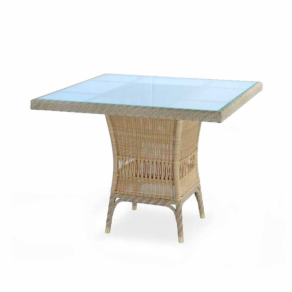 Denna matbord har en central bas och en glasskiva kantad med en väv i ett fiskbensmönster, vilket ger den en karakteristisk touch av unikhet.