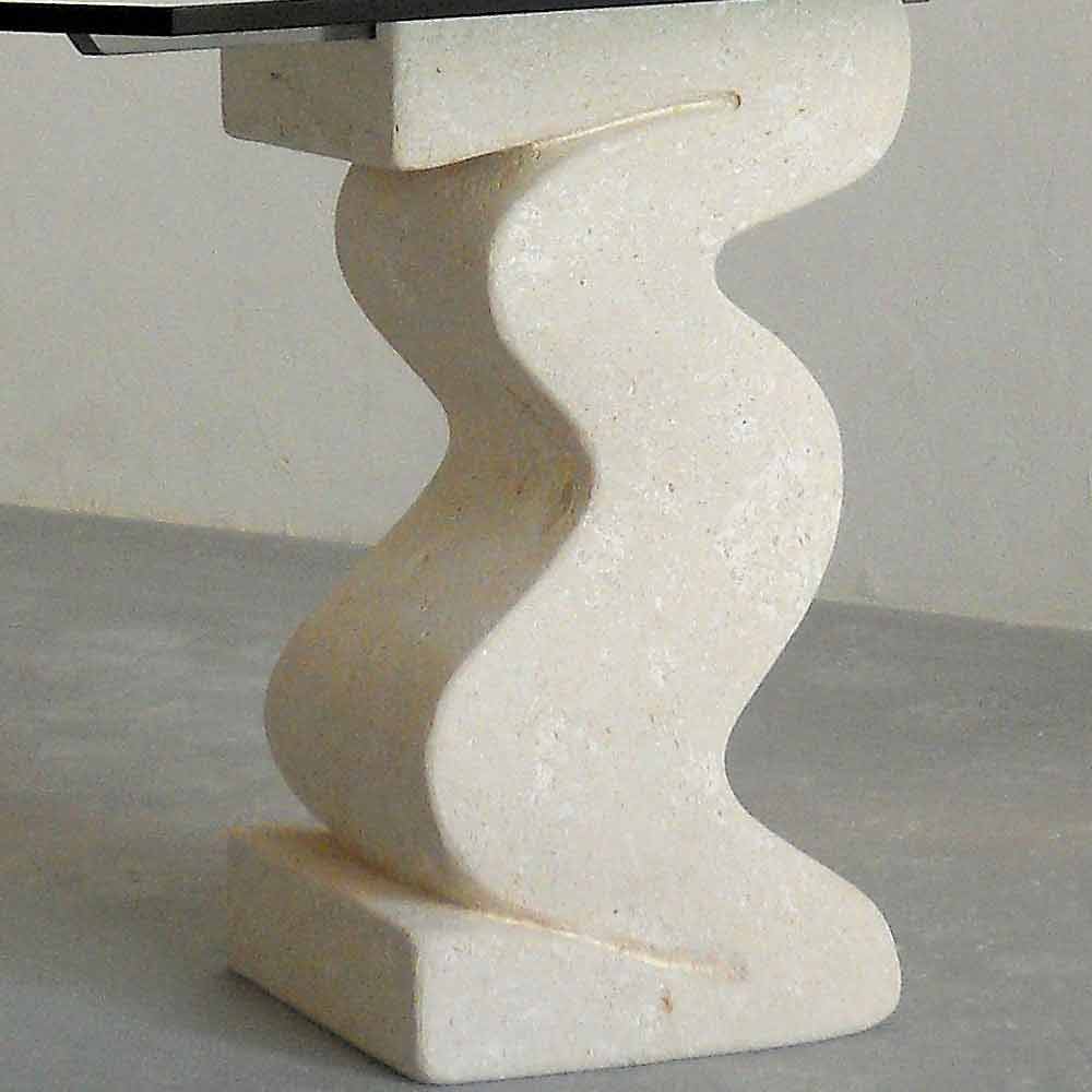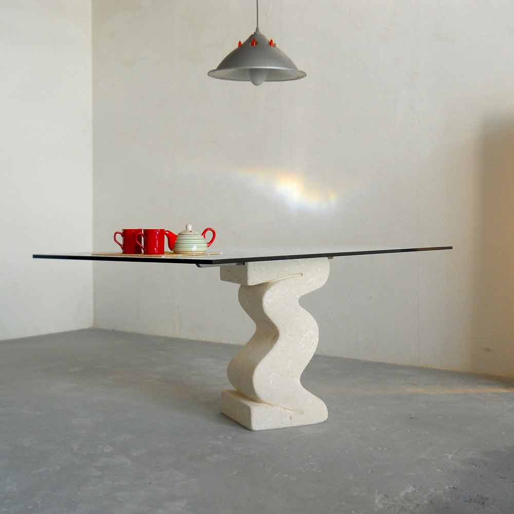 Rektangulärt matbord moderna Tillverkad i Italien med central bas i Vicenza natursten, hand huggen från massivt block och med flottör glasskiva tjocklek av 15 mm, med stöd av en grov borstad och målade metallstång.