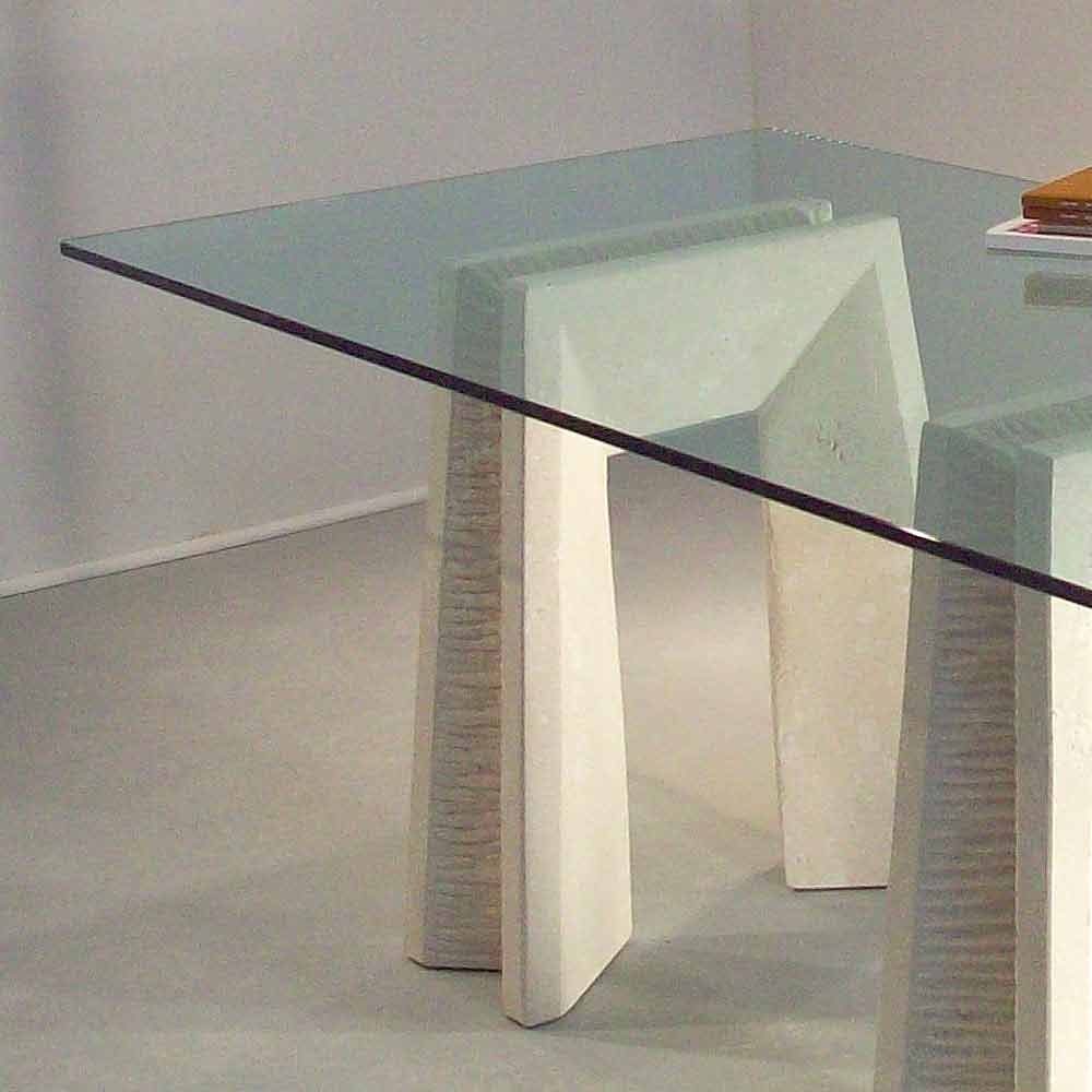 Rektangulärt matbord moderna tillverkad i Italien med dubbel bas i natursten i Vicenza, manuellt huggen ur massivt block och med flottör glasskiva tjocklek av 15 mm, vilande på baserna.
