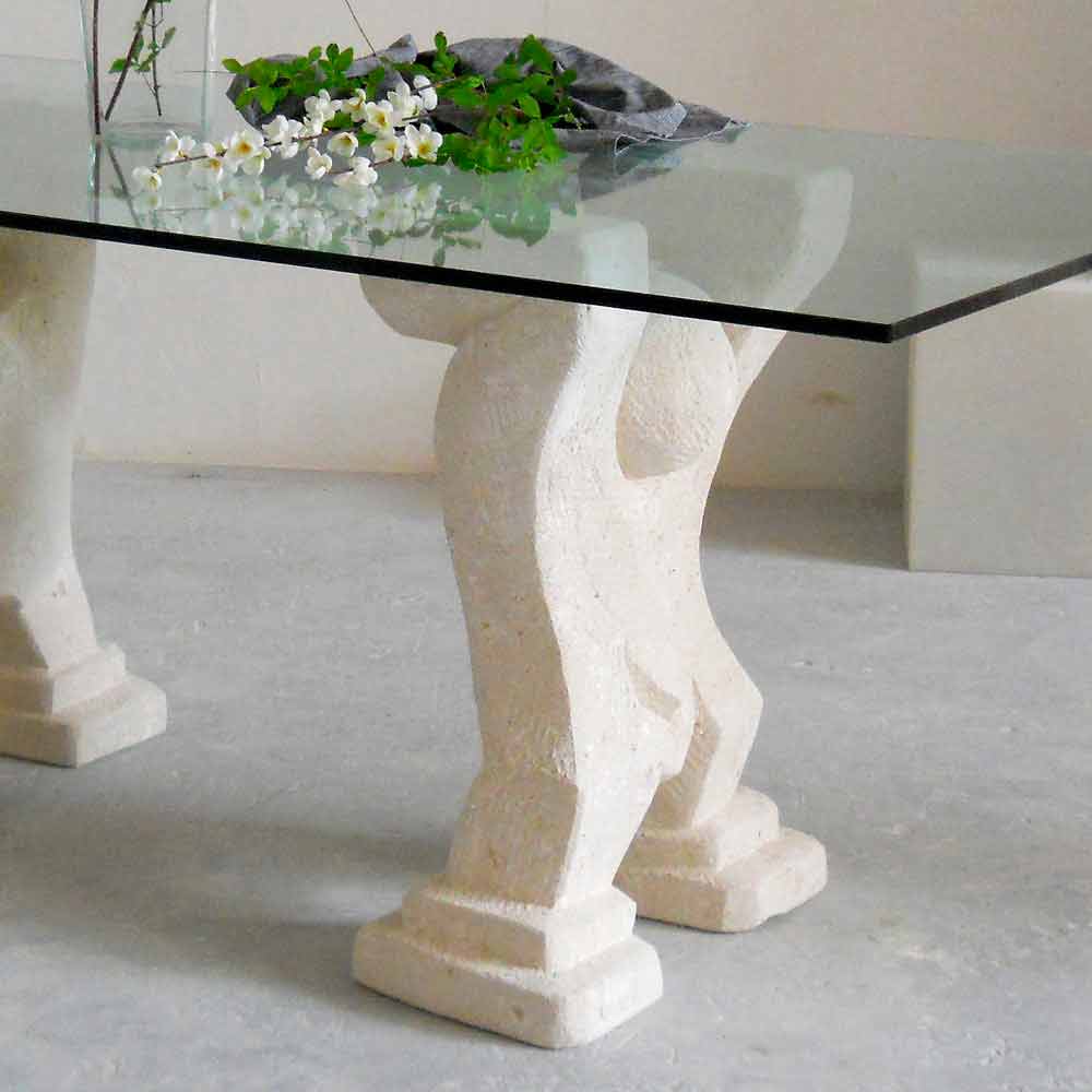 Rektangulärt matbord moderna Tillverkad i Italien med dubbel bas i natursten i Vicenza, manuellt huggen ur massivt block och med flottör glasskiva tjocklek av 15 mm, vilande på baserna.