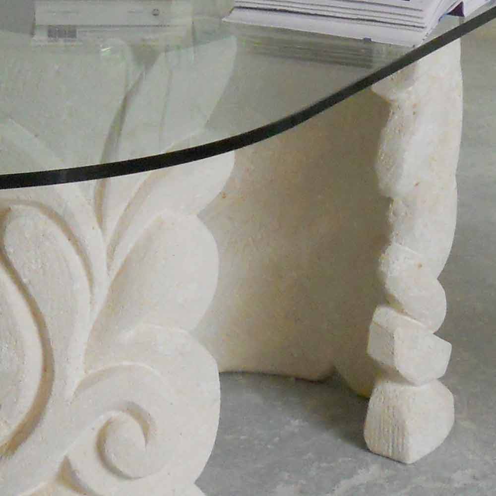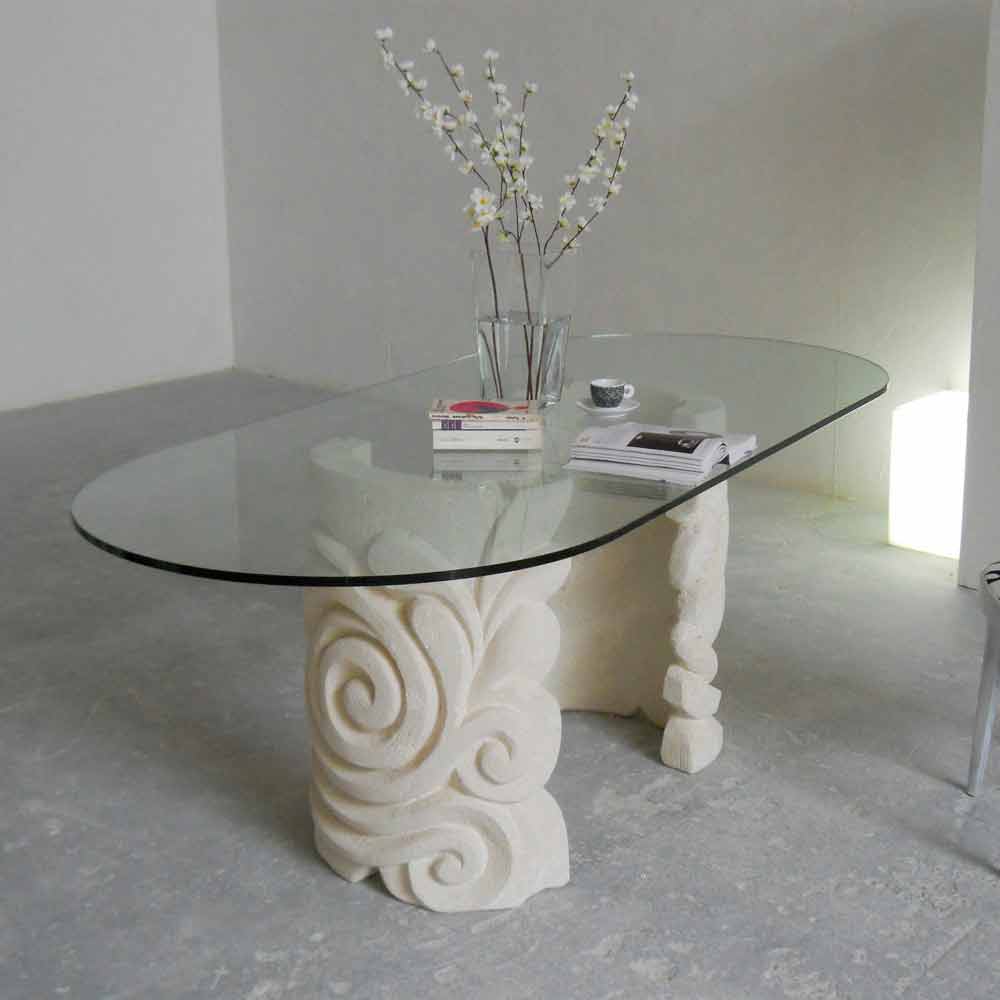 Ovalt matbord i modern stil Tillverkad i Italien med dubbel bas i natursten i Vicenza, manuellt huggen ur massivt block och med flottör glasskiva tjocklek av 15 mm, vilande på baserna.