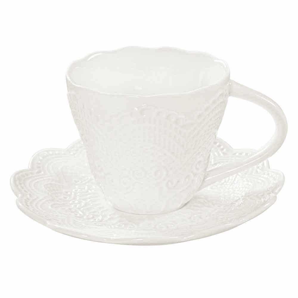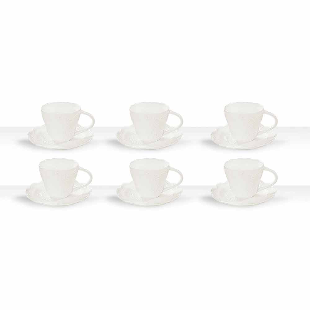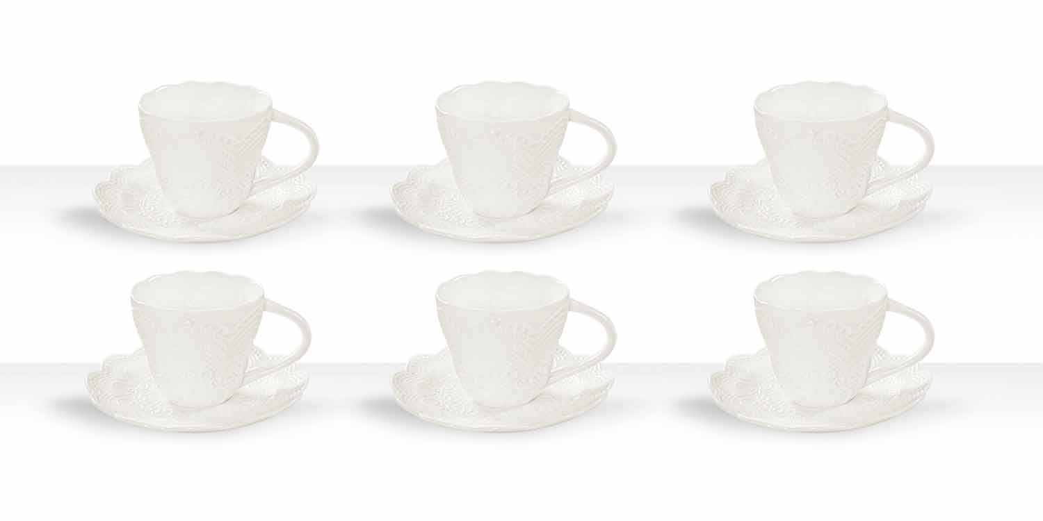 6 tekoppar med fat i vitt porslin av raffinerad barock stil.