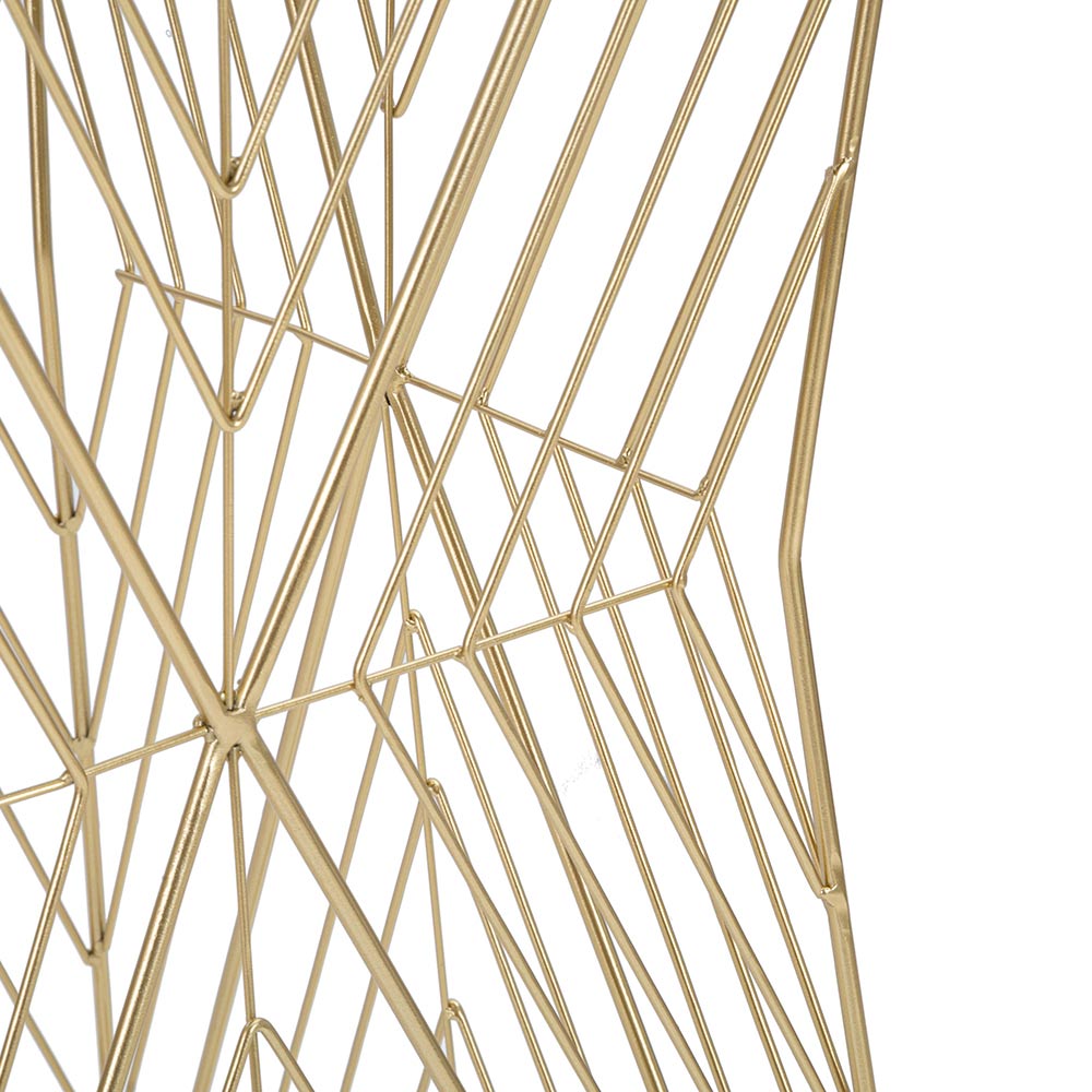 Detta soffbord kombinerar värmen från modern design med den funktionalitet som önskas i varje hem. Dess bas är en geometrisk härva av gyllene järnlinjer, som skär varandra och skapar en nästan hypnotisk effekt, en skulptur som stöder en sober stödyta. Den öppna siluetten tynger inte utrymmet, utan lägger snarare till ett inslag av lätt elegans .