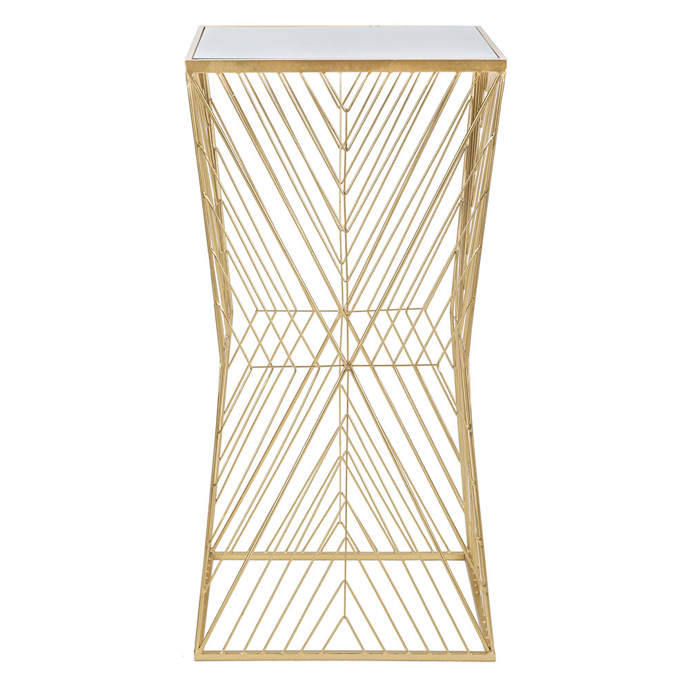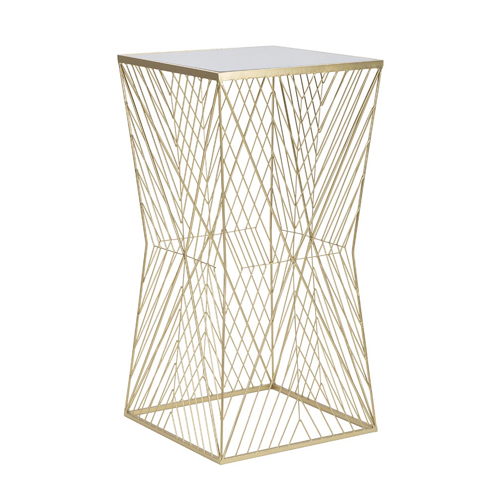 Glasskivan, inställd i en gyllene ram, är praktisk och lätt att rengöra, och erbjuder en idealisk yta för dina favoritdekorationsföremål, från en designlampa till en frodig växt. Strukturen erbjuder en touch av gnistra som kan liva upp alla rum, från vardagsrummet till sovrummet, utan att gå för långt i överflöd.