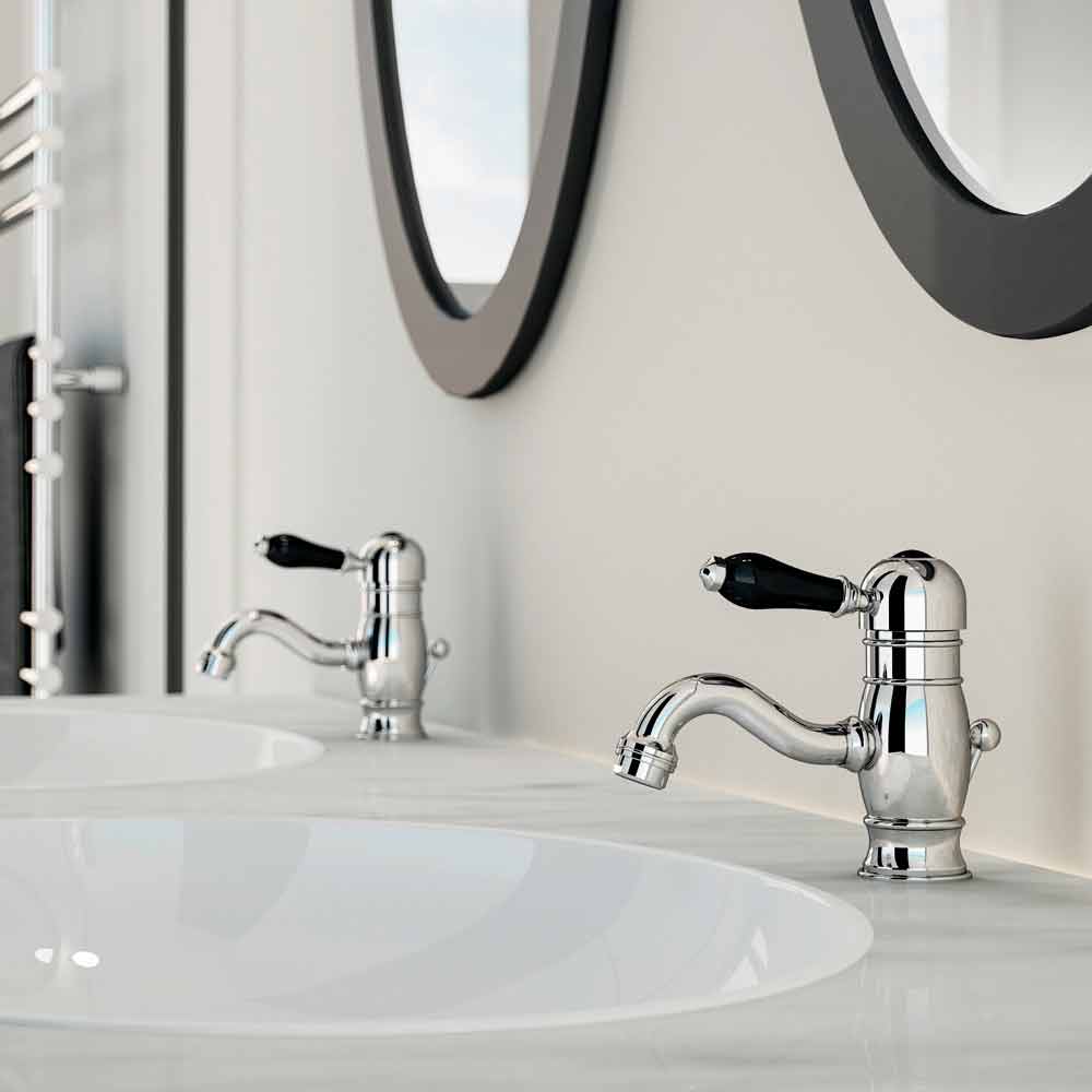 - krom & svart keramik (finish på en krombas, med eleganta svarta keramiska insatser på handtaget).