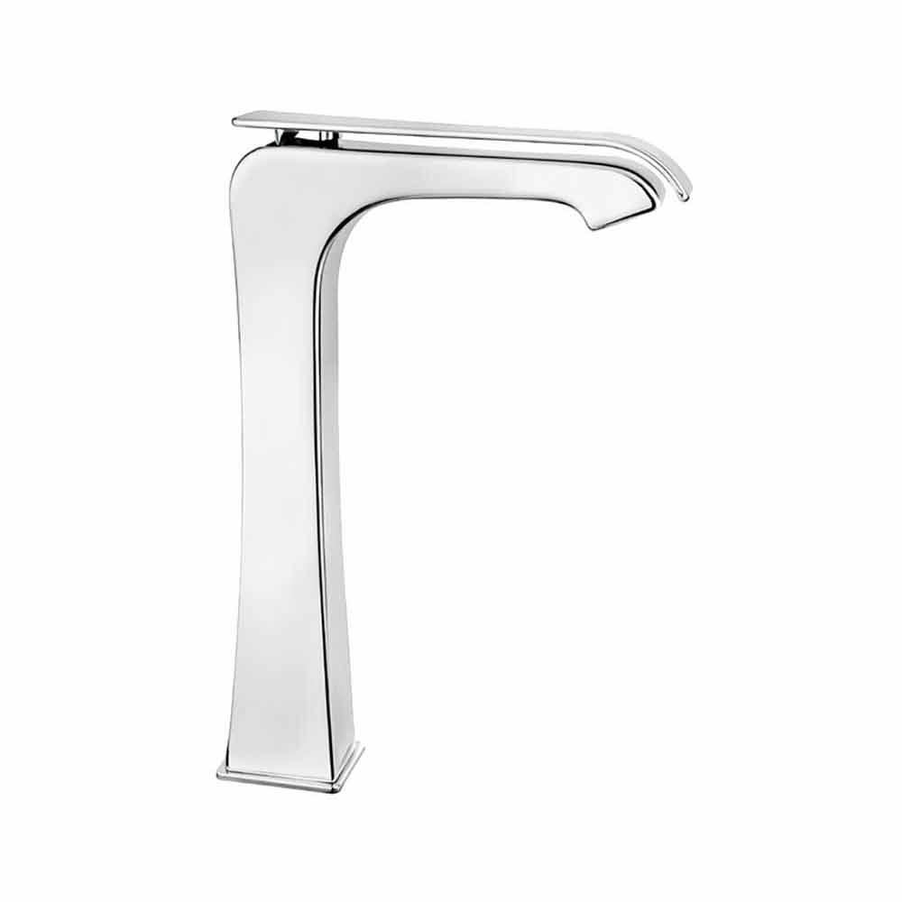Ultramodern och kreativ design tvättställsblandare i kromfinish mässing 275 mm hög och med 135 mm mittavstånd, utan avlopp och utan pop-up-hål.