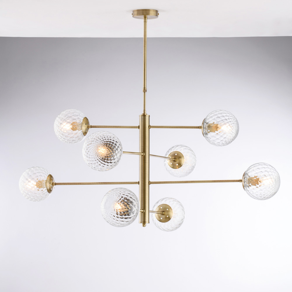 Denna eleganta och moderna pendellampa i järn utmärker sig med sin balanserade, geometriska komposition. De horisontella armarna stöder sfäriska glasdiffusorer, vilket skapar ett raffinerat samspel av symmetrier som kastar ett diffust, harmoniskt ljus.