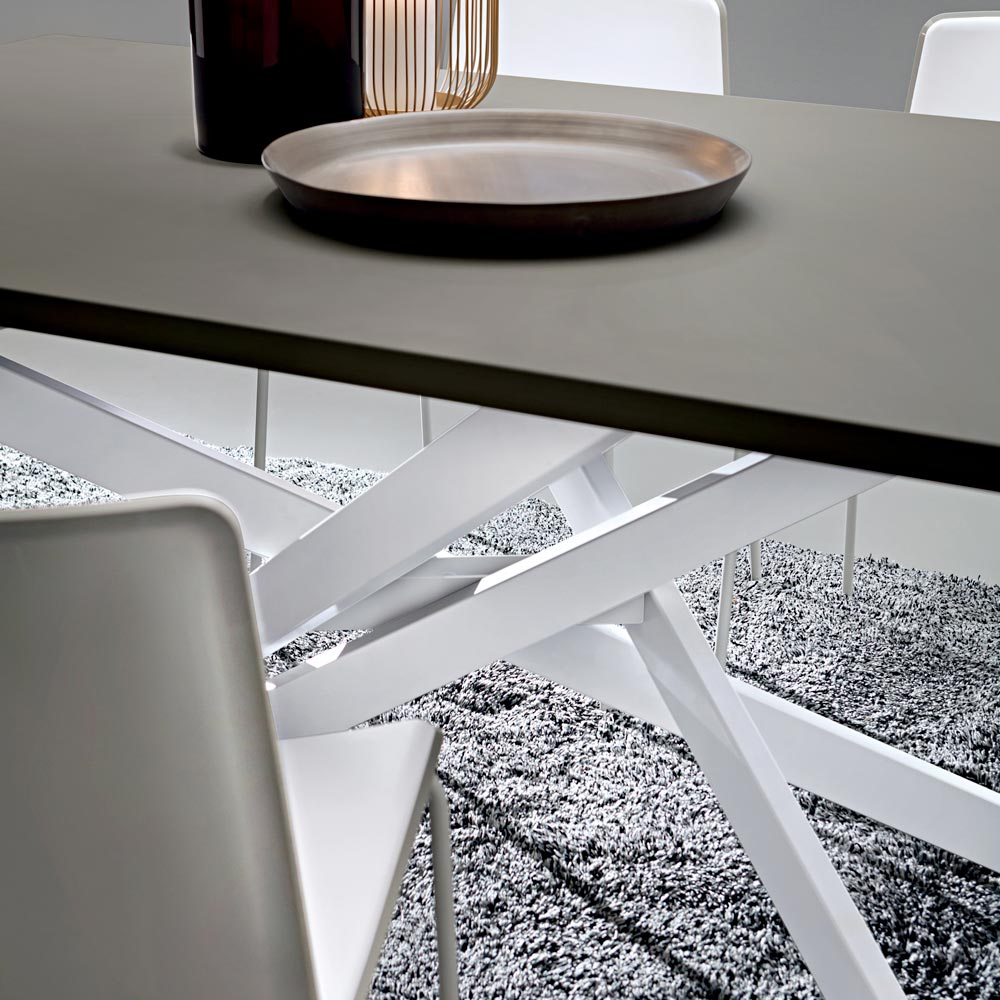 en enkel och mångsidig själ vars design berikas och görs unik genom den speciella formen på benen som tack vare den ovanliga vävda formen ger bordet dess sanna