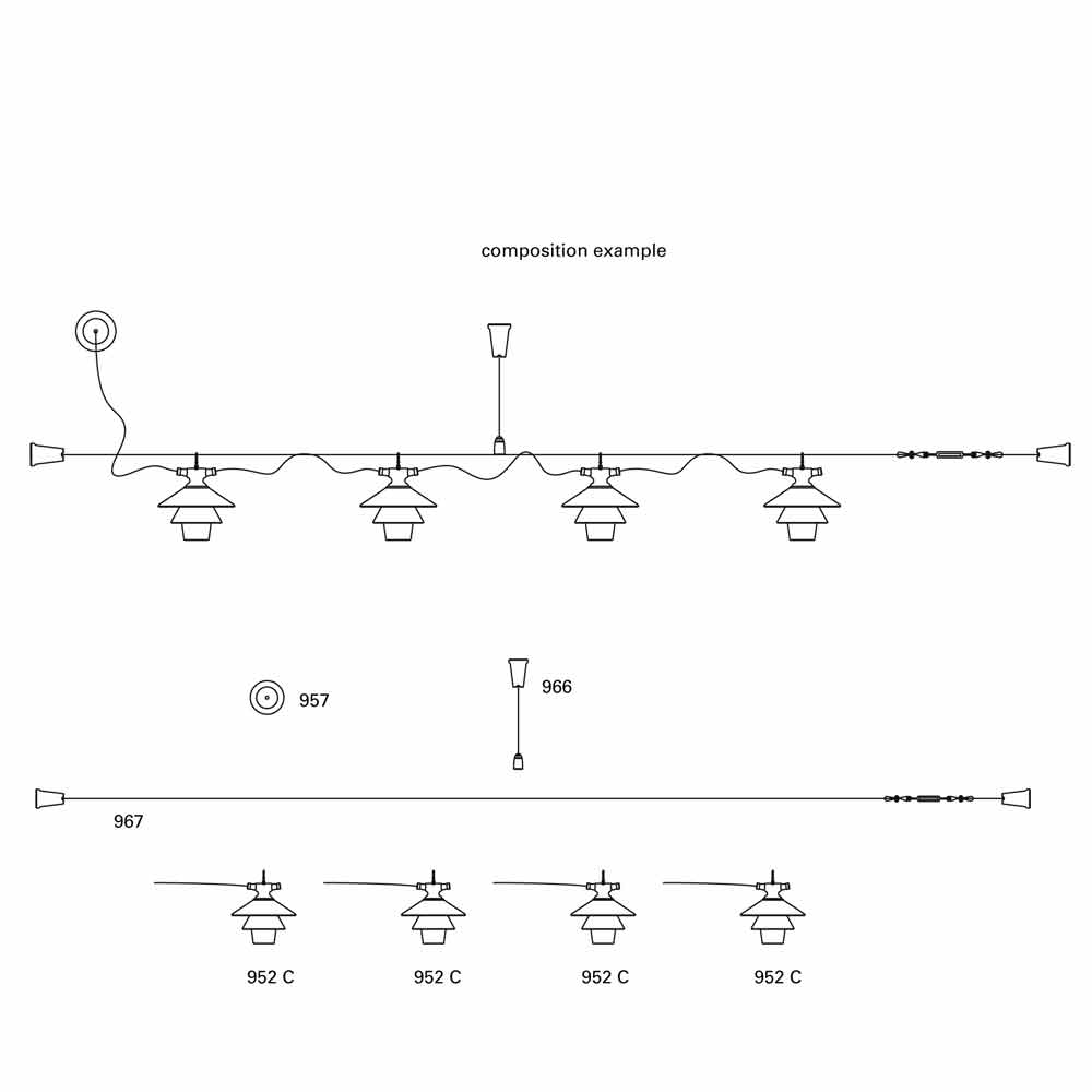 För anslutning till takrosa artikel 970 . Tack vare takrosen är det möjligt att skapa intressanta ljuskompositioner genom att kombinera denna lampa med de andra upphängningslamporna i kollektionen: 951, 954-22 och 952.
