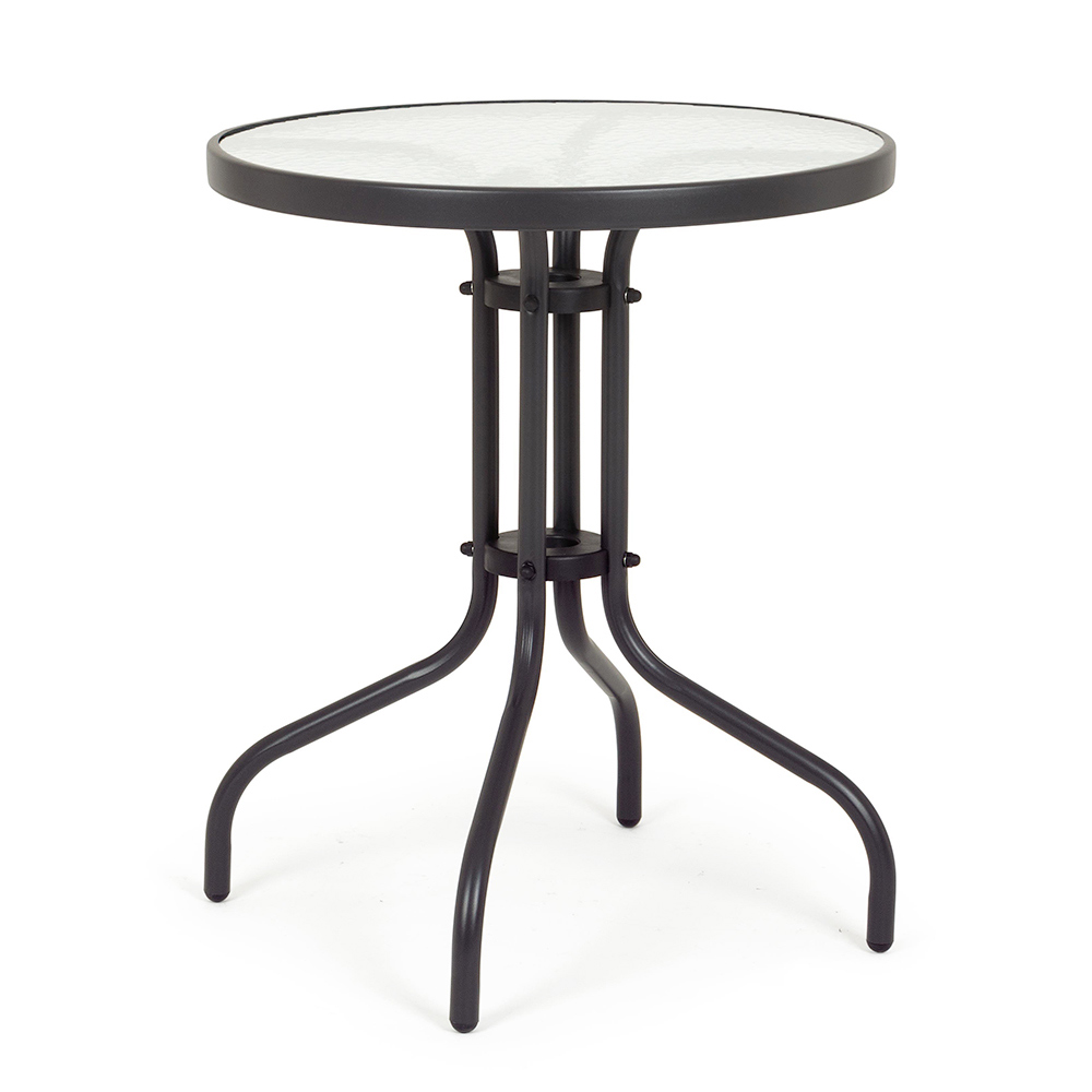 Rundt stål utomhusbord med glasskiva, trädgårdsartikel.