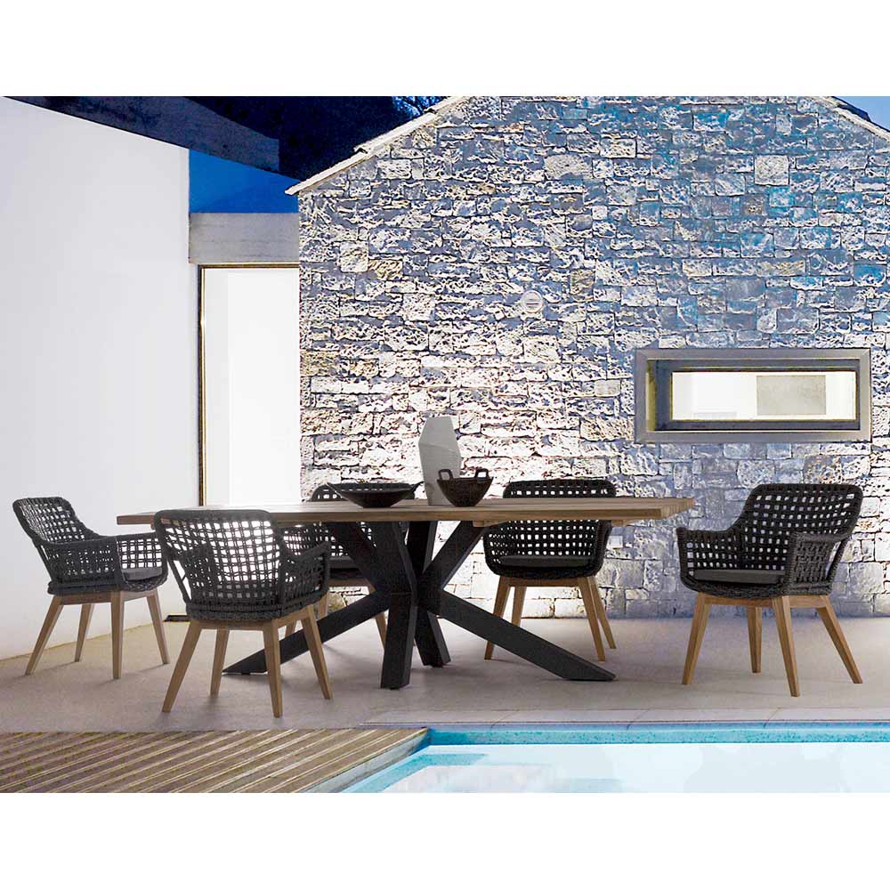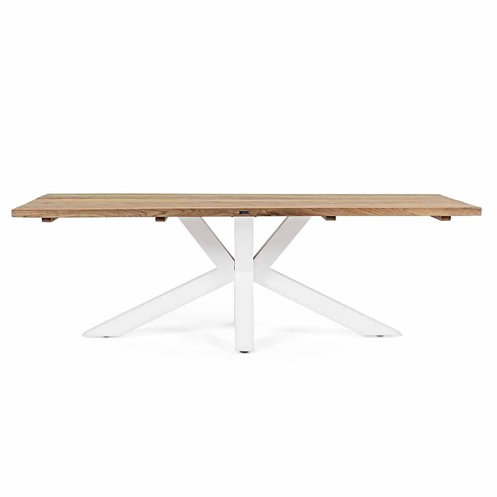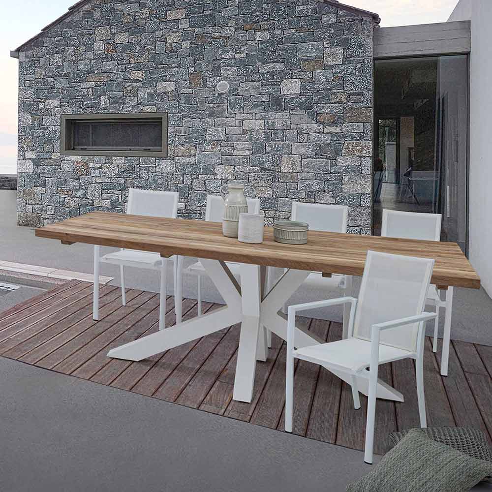 Modernt utomhusbord med vita eller svarta aluminiumben och topp av teakträ, för 10 personer.