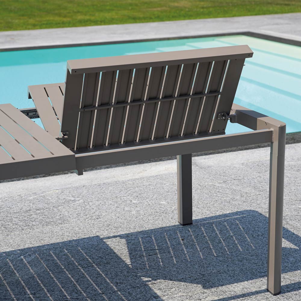 skjutbenen . En möbel vars estetik präglas av balanserade volymer och tydliga former som gör att den kan inreda alla utomhusmiljöer, både inhemska och privata, med