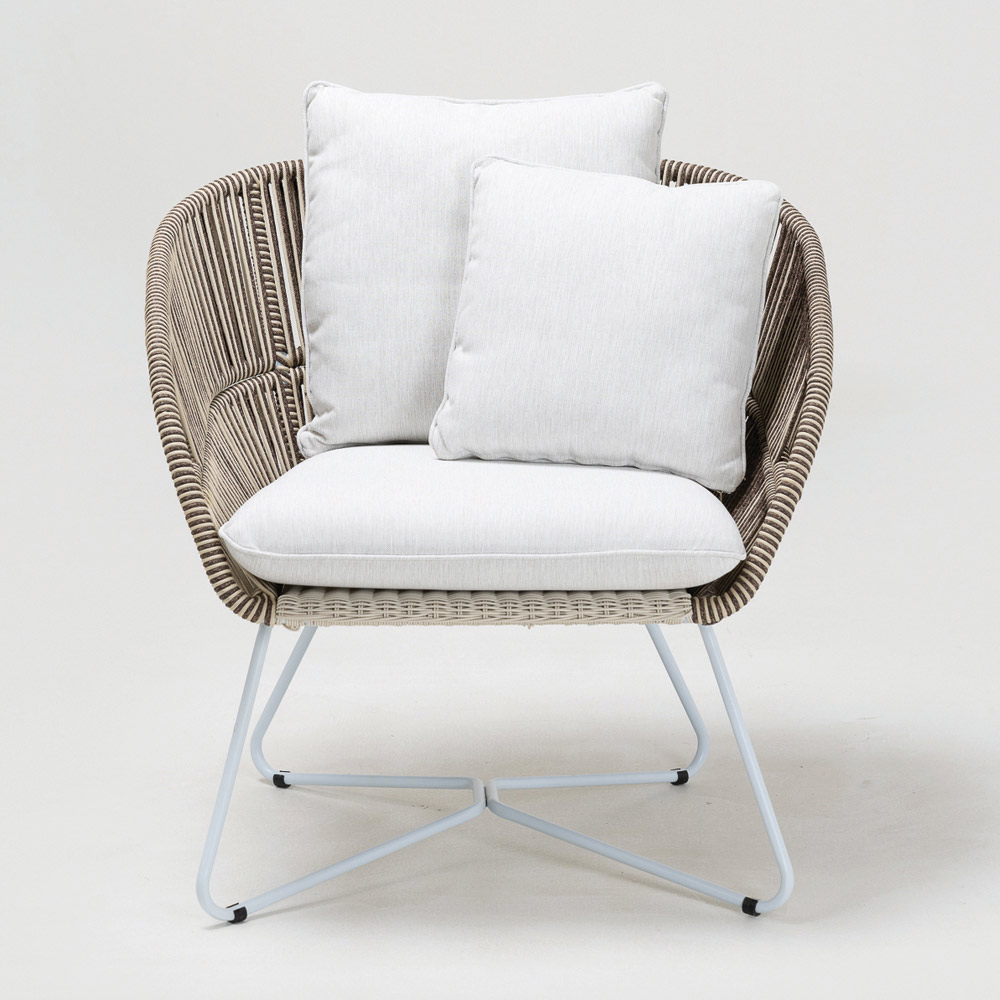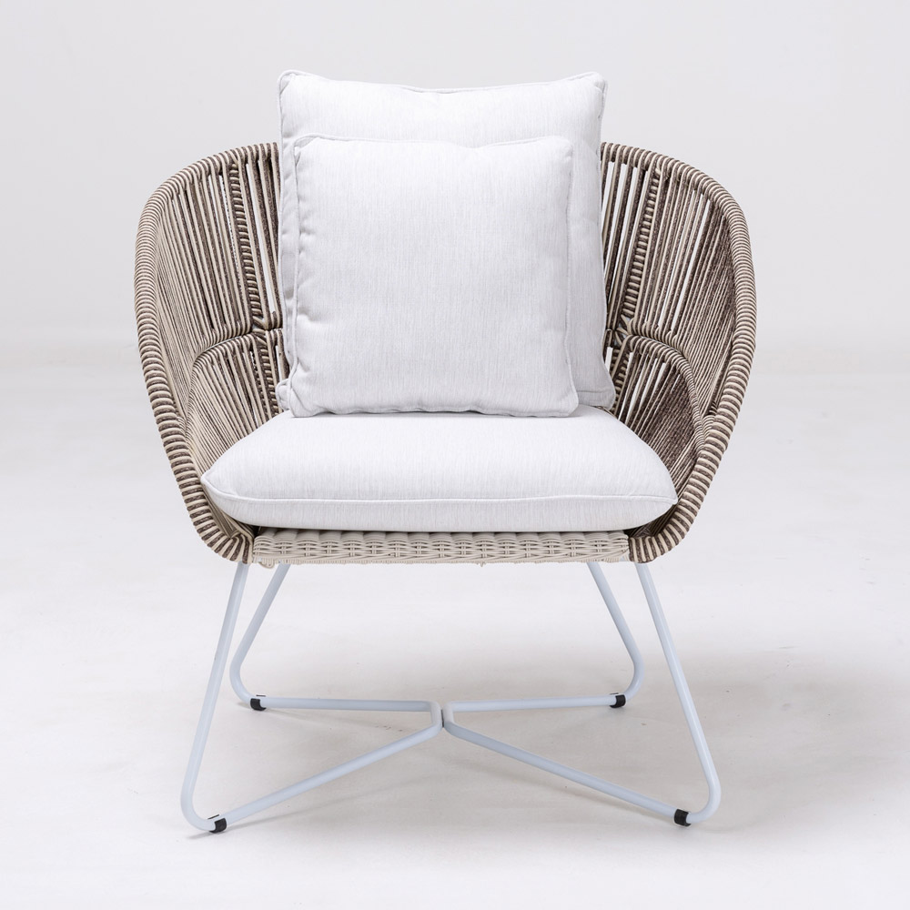 De mjuka kuddarna, klädda i högkvalitativt benvitt tyg, inbjuder dig att koppla av och njuta av den friska brisen ute, medan deras neutrala färg gör att de enkelt kan matcha ett brett utbud av utomhusdekorationer. Denna fåtölj är inte bara en sittplats, utan en plats för personlig reträtt, där design möter funktionalitet och smälter samman med estetiken i utomhusmiljön.