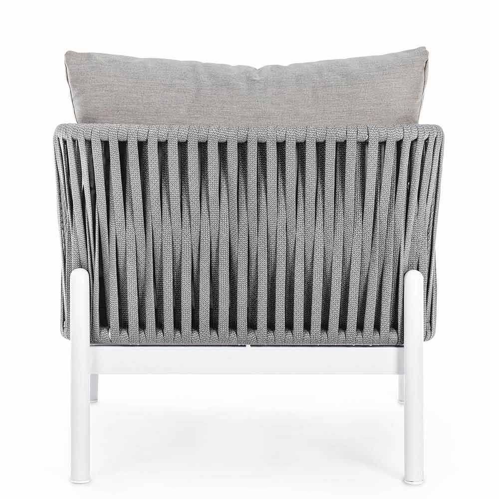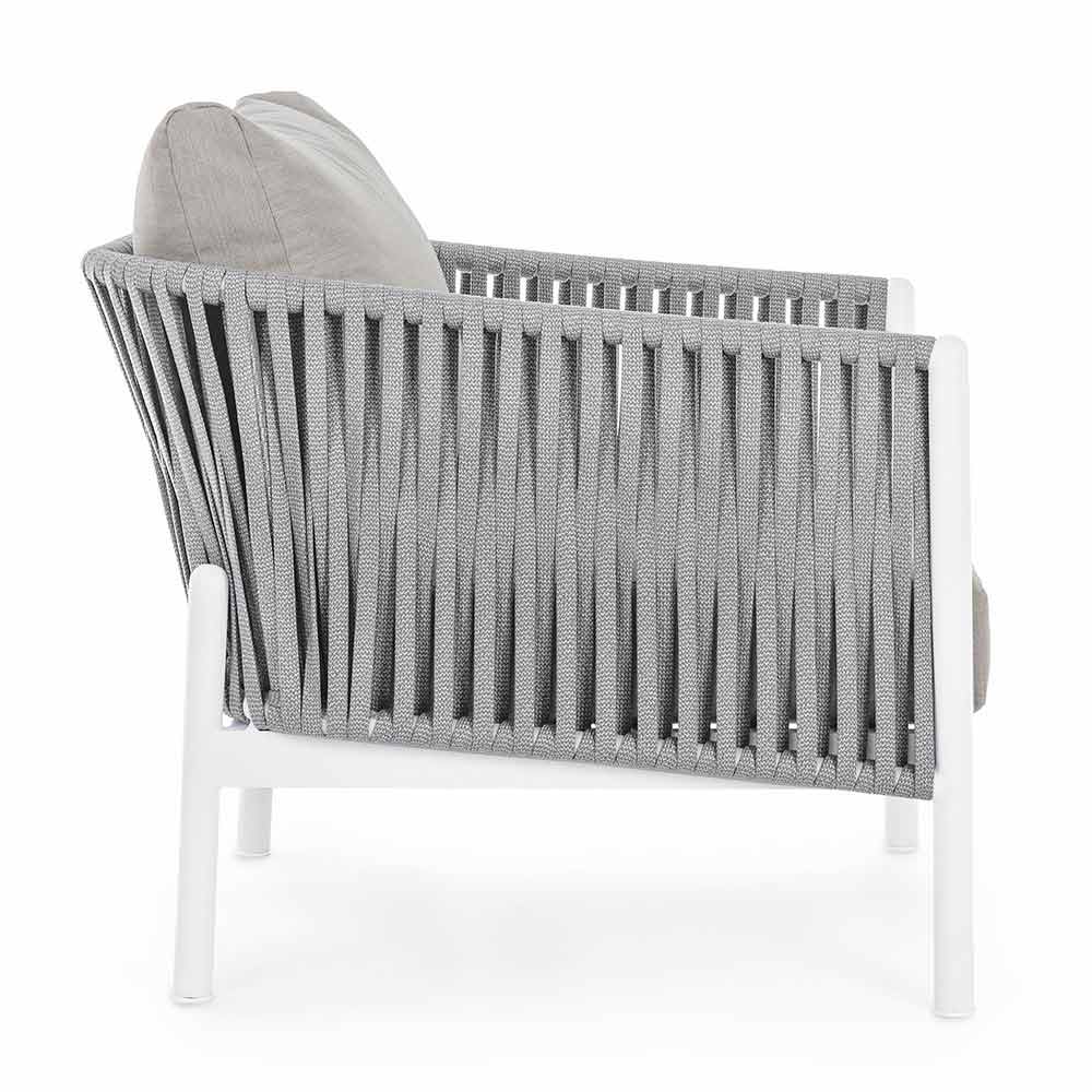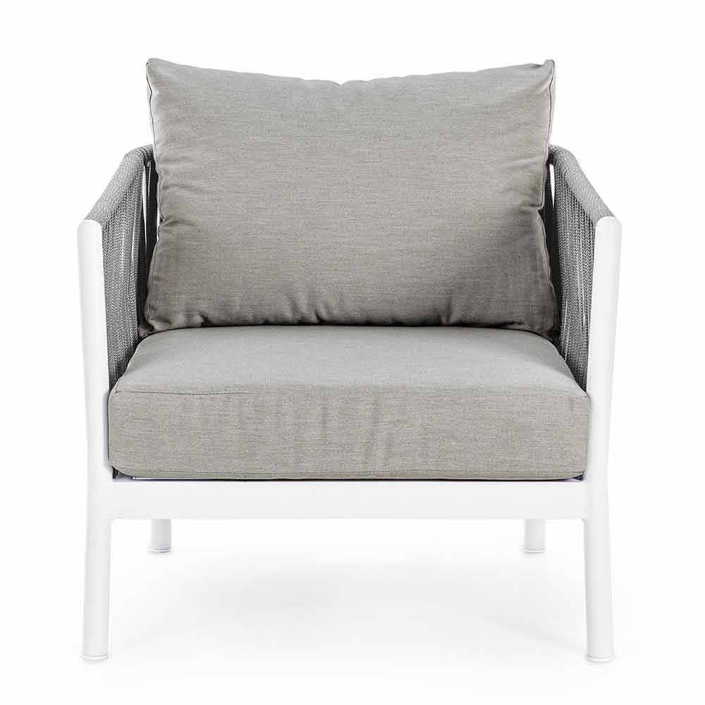 Utomhus designfåtölj med vit aluminiumstruktur och avtagbara kuddar.