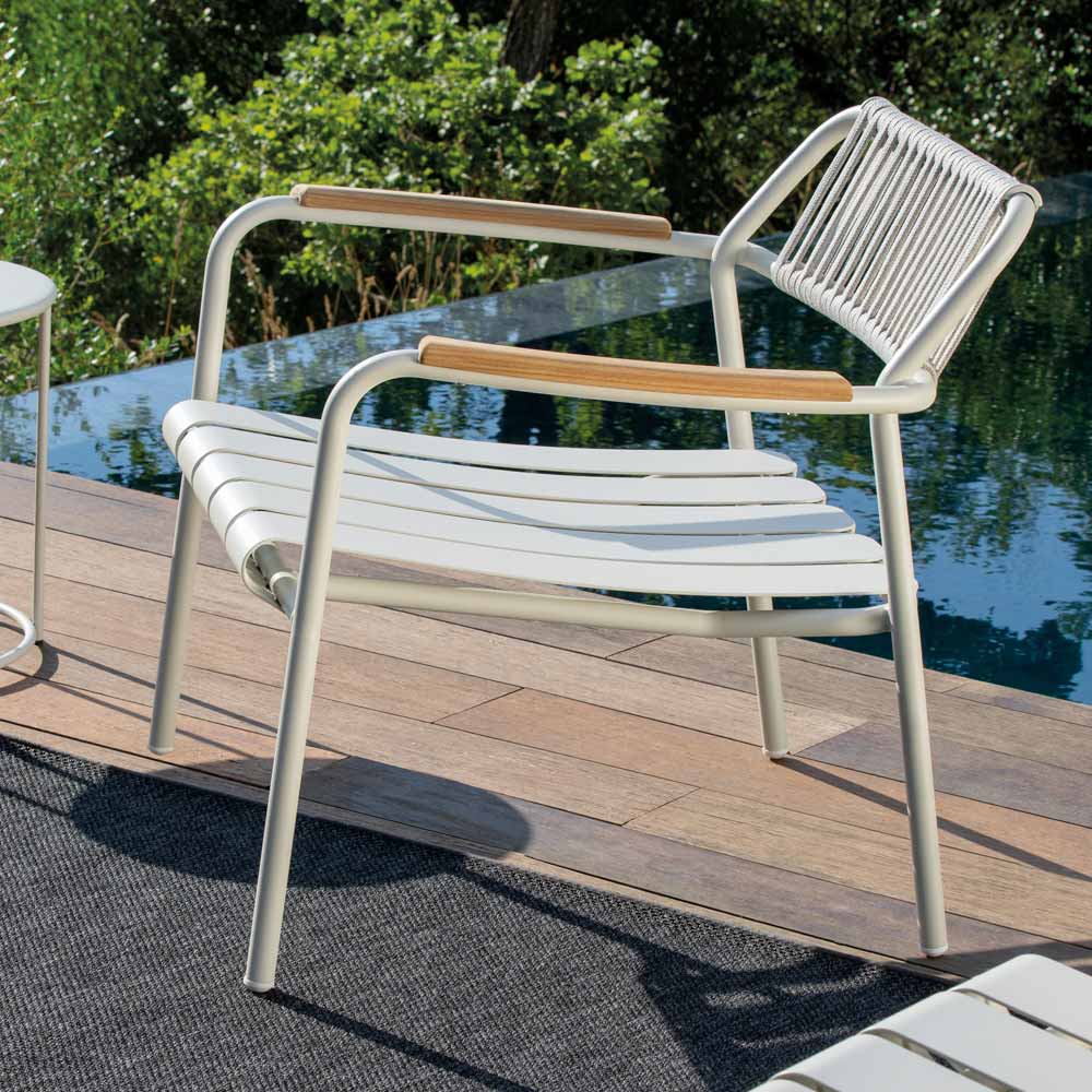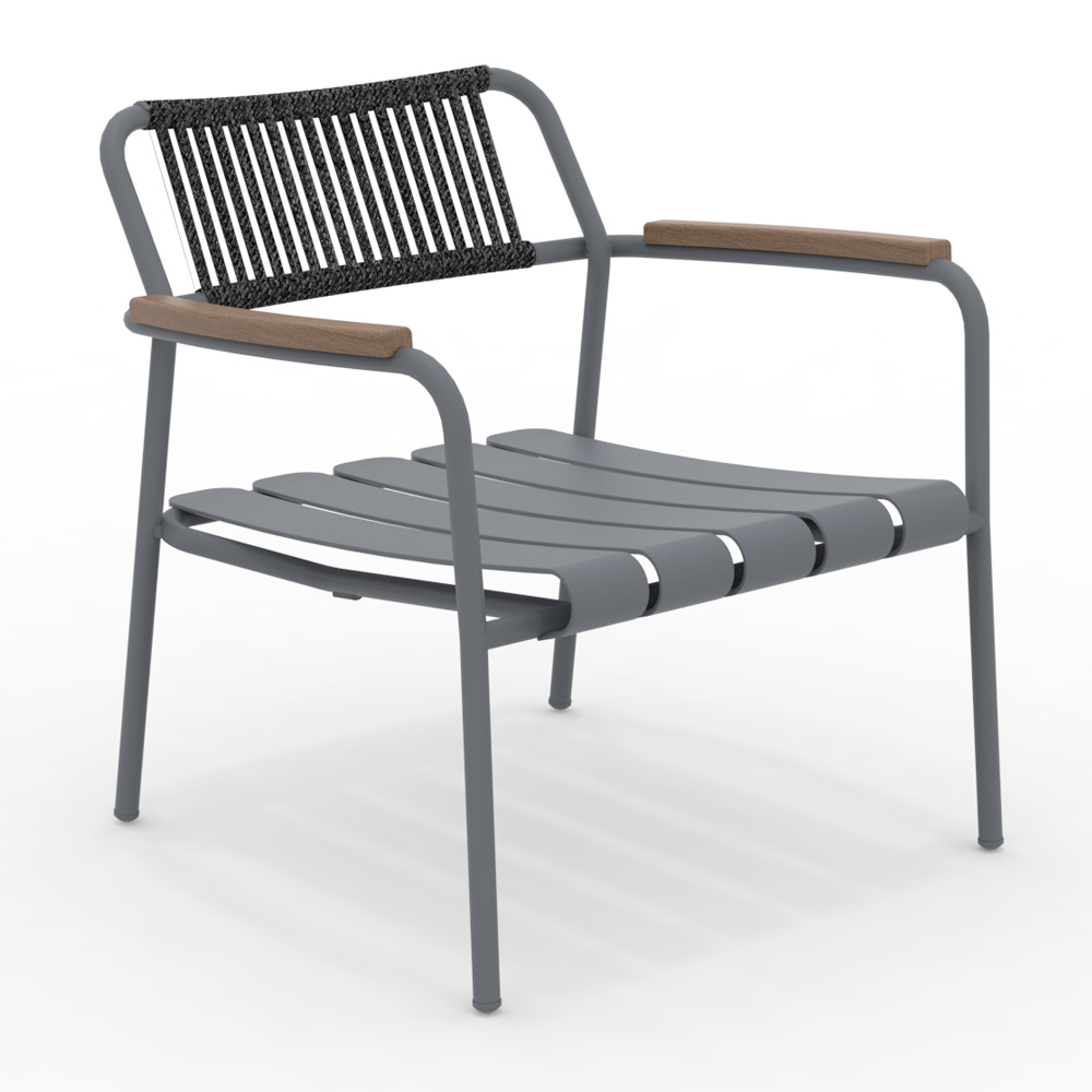 Den lätta men robusta strukturen är utformad för att erbjuda bästa möjliga komfort, med en ergonomisk sits och ett format ryggstöd i rep , vilket säkerställer ett bekvämt och avkopplande stöd. Aluminiumlamellerna ger ett dynamiskt och modernt utseende, medan finishen tillför en touch av elegans och förfining.