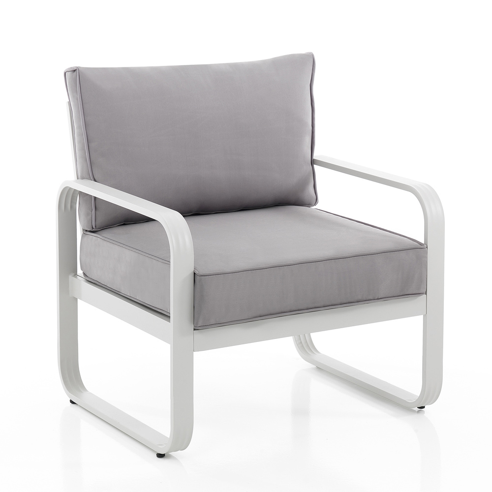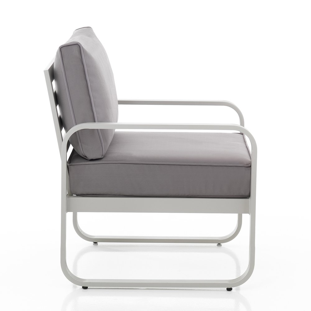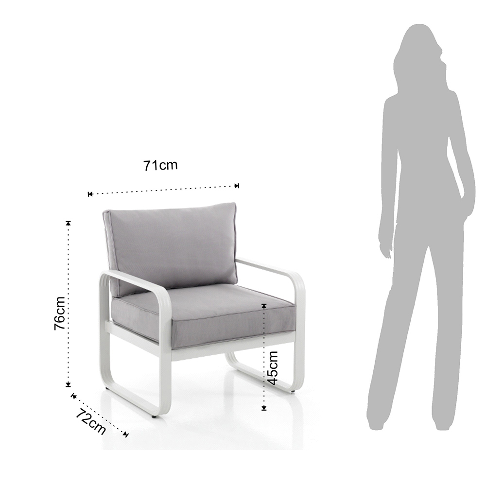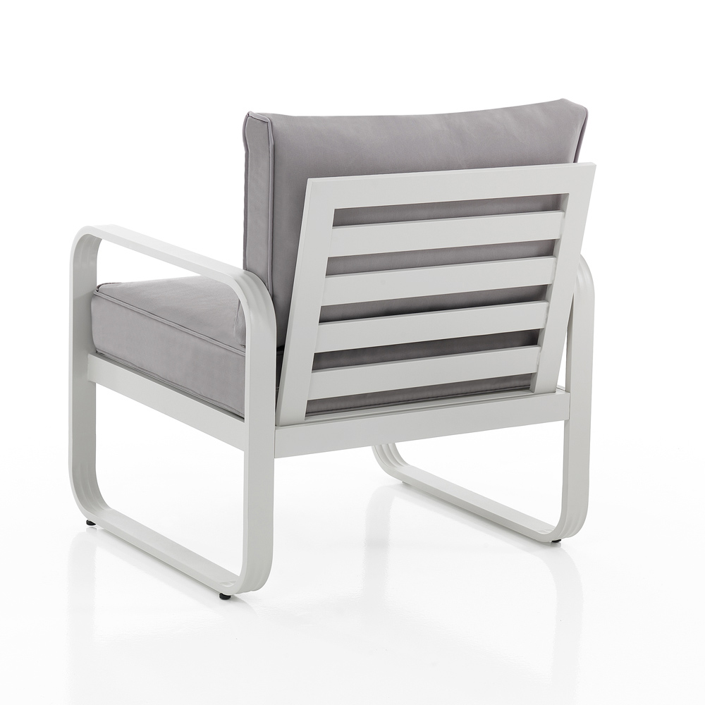 Denna fåtölj är emblemet för minimalistisk komfort för utomhusutrymmen . Dess rena linjer och aluminiumstruktur erbjuder en modern och fängslande estetik som anpassar sig med mångsidighet till både moderna trädgårdar och terrasser i mer klassisk stil.