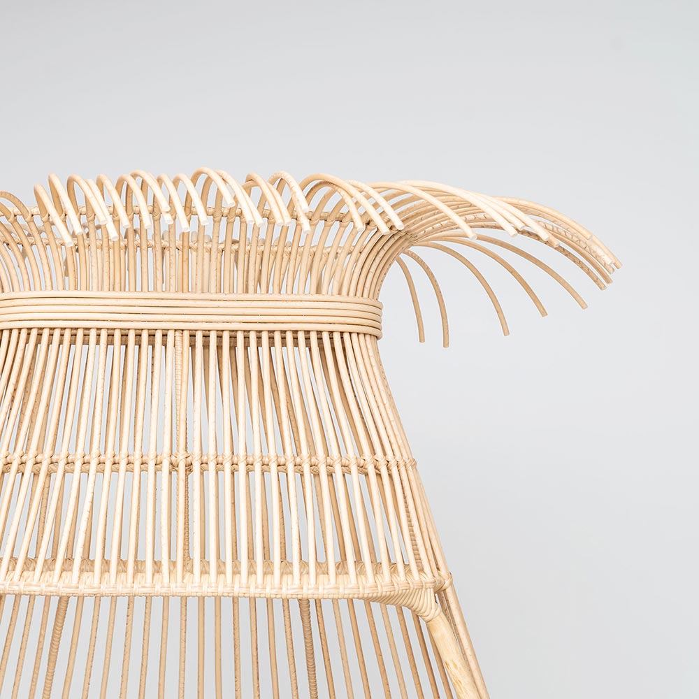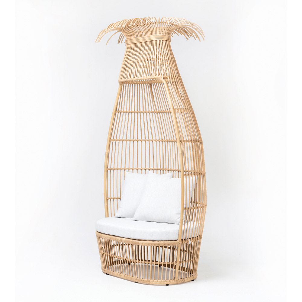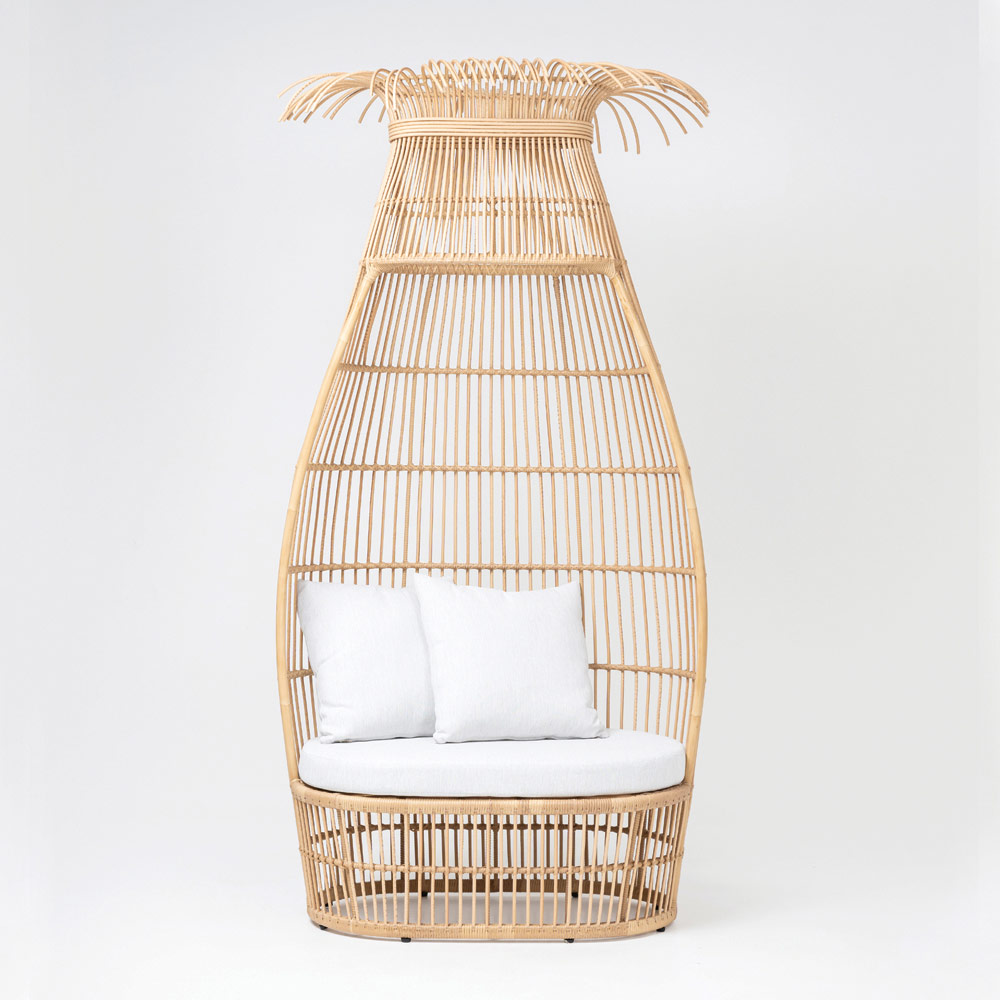 Den här trädgårdsfåtöljen är ett sant bo av elegans och komfort . Den höga, ovala ramen, som är tillverkad av konstrotting, för tankarna till exotiska stränder och smälter harmoniskt in i utomhusmiljön. Den öppna, luftiga designen säkerställer luftflöde och ljus, medan den böjda formen ger en känsla av skydd och privacy .