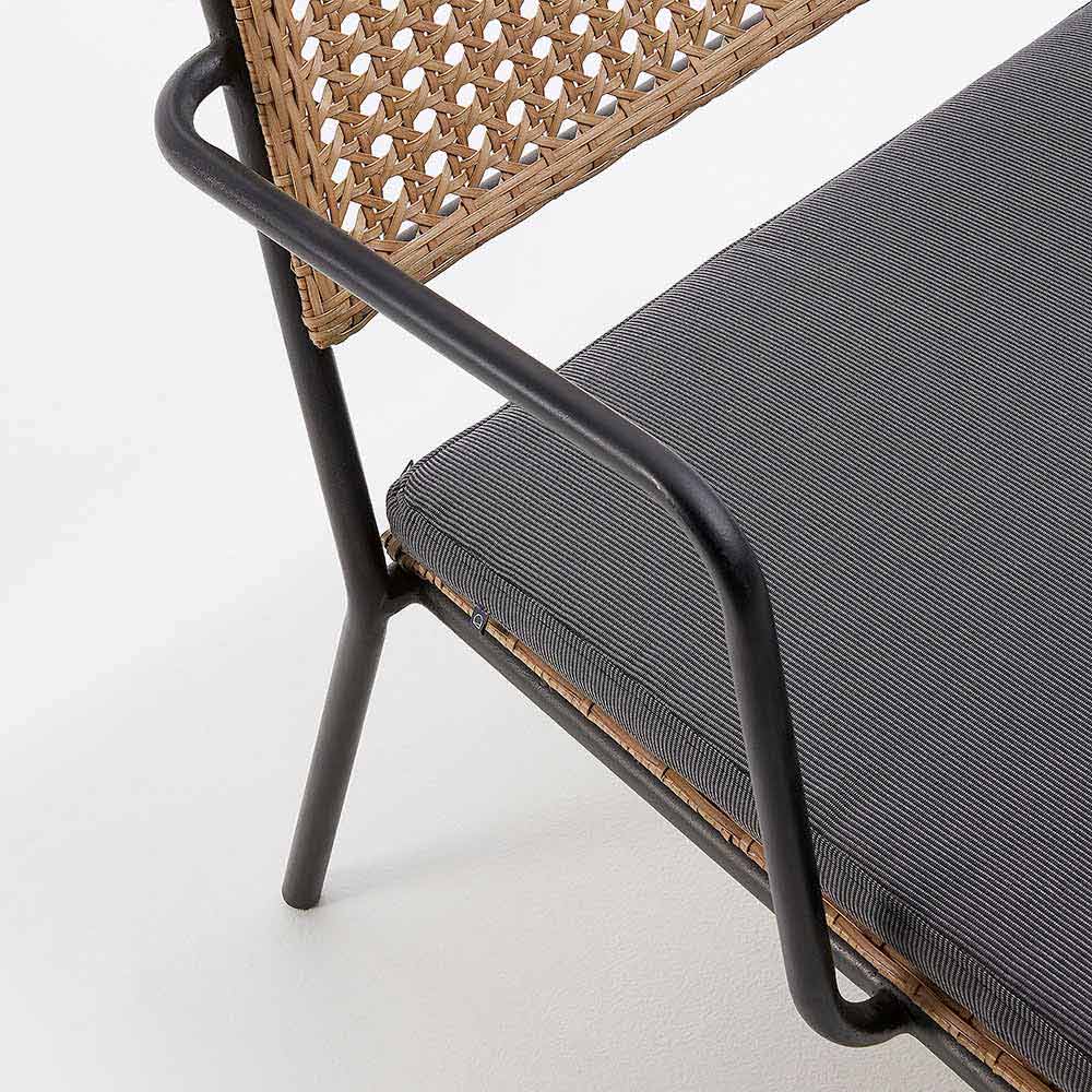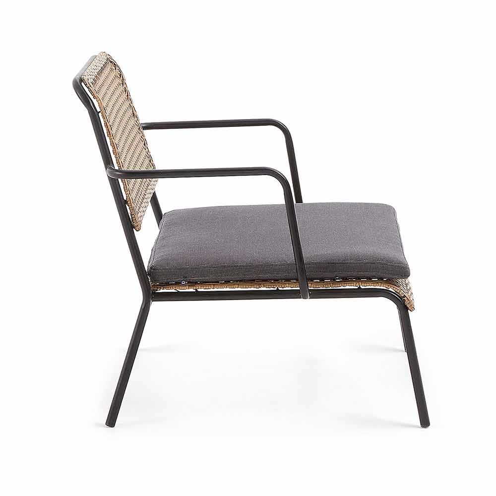 Trädgårdsfåtölj tillverkad med en svart pulverlackerad galvaniserad stålram; sits och ryggstöd i beige vävd polypropen.