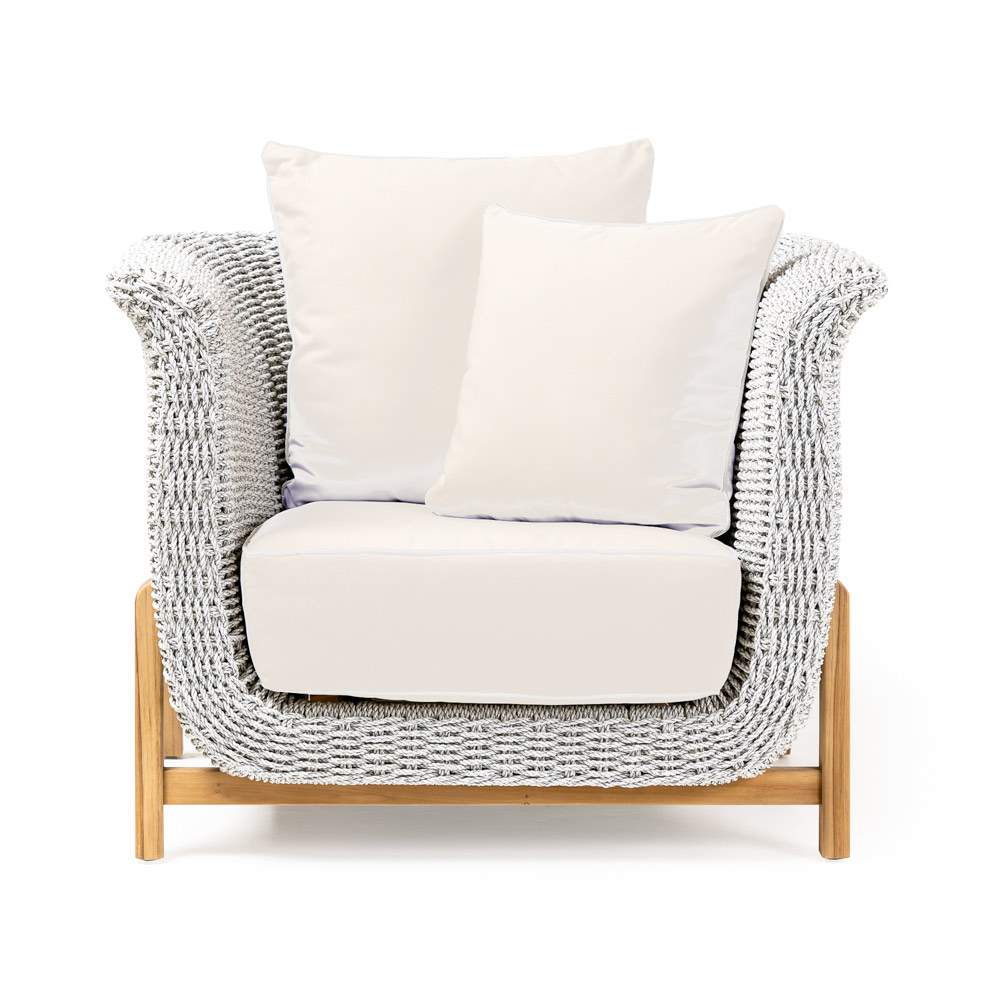 Denna fåtölj för utomhusbruk är tillverkad med en inre struktur i epoxipulverlackerad aluminium ram, bas i teak och handvävt VRO-rep. Den är komplett med sitt- och ryggkuddar i vattenavvisande tyg i Havana grey .