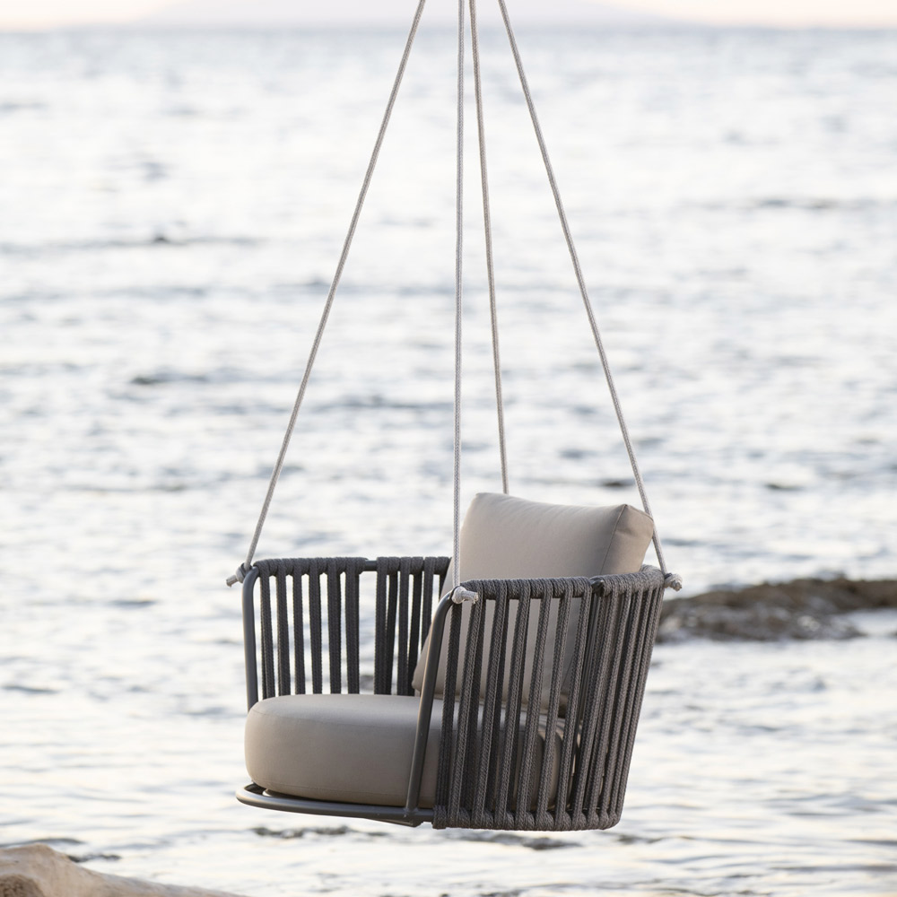 Möbelgunga i galvaniserat stål och rep, helt tillverkad i Italien, inklusive sitt- och ryggdynor och rep . Galvaniseringen ger bättre motståndskraft mot korrosiva atmosfäriska ämnen, medan repen är resistenta mot klor och solljus samt mögelskyddande. Dynorna är tillverkade av ett material som är resistent mot UV-strålar och vatten, vilket behåller färgen länge, vilket gör gungan till ett perfekt element för att inreda alla utomhusmiljöer.