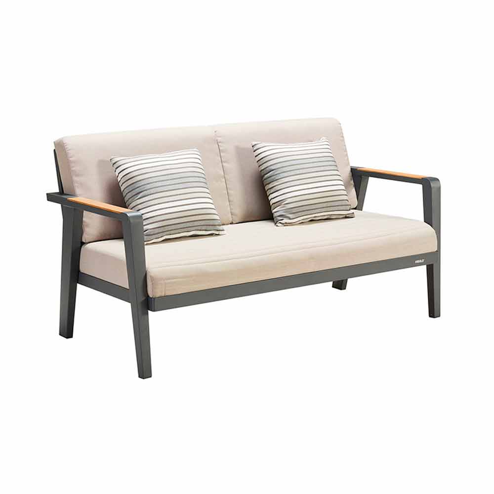 Trädgårdslounge med 2-sits soffa, 2 fåtöljer och soffbord i grå aluminium och teak.