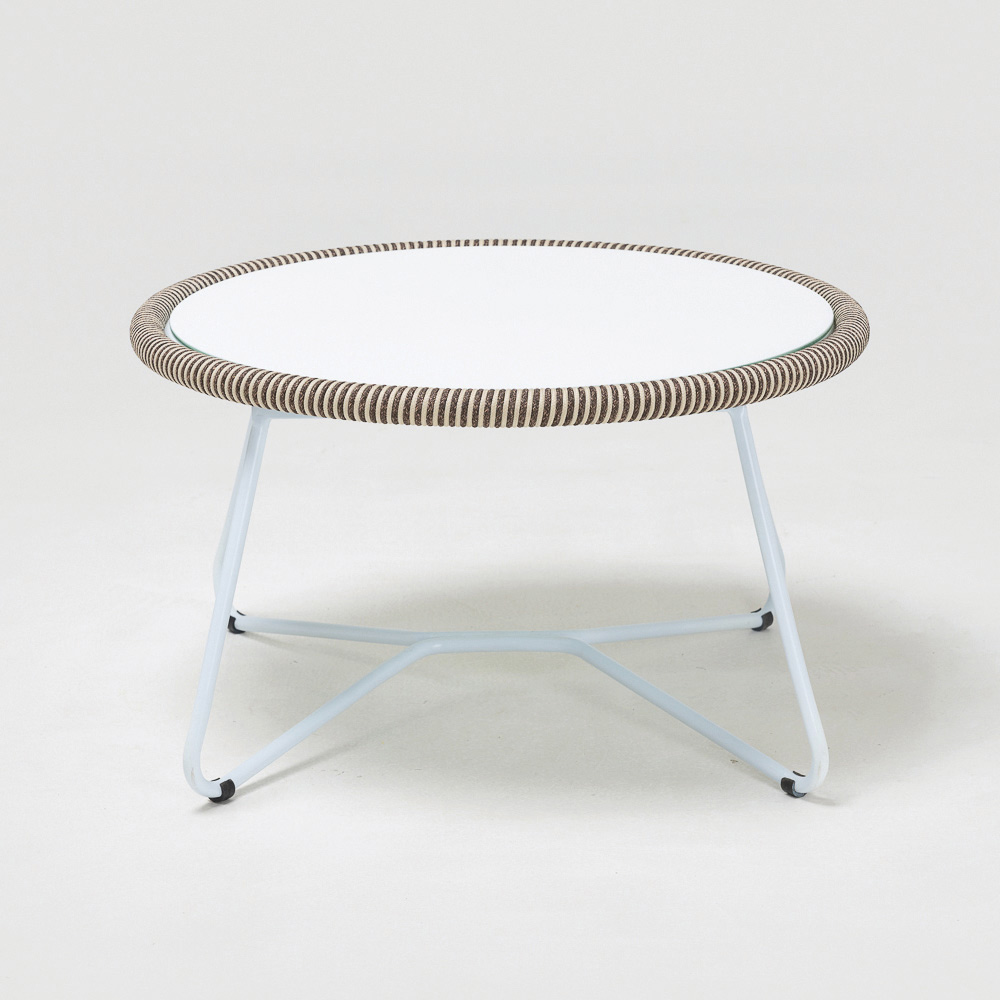 rep-strukturen ger en touch av motstånd och hållbarhet mot elementen och bibehåller sin skönhet över tid. Designen förstärks ytterligare av aluminiumdetaljer som ger en fräsch och modern känsla och gör att den sticker ut i trädgårdar, på terrasser eller vid poolen. Det matchande soffbordet, med sin glas-skiva, är det perfekta komplementet för att servera drinkar och snacks, vilket gör det till den perfekta uppsättningen för dina gäster och för dina utomhuskvällar.