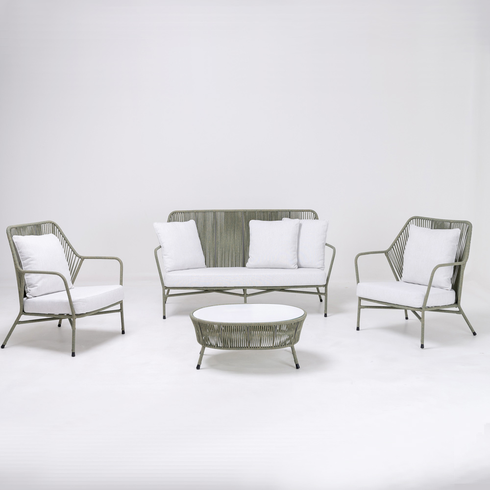 Trädgårdsloungeset i aluminium, ROPE+ repväv, glas och dynor