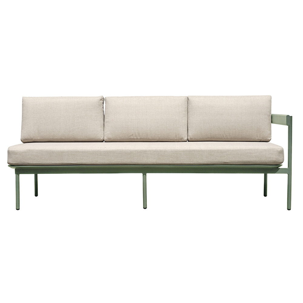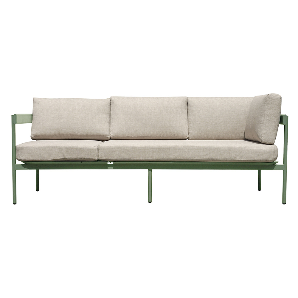 Loungeset utomhus med 2 stycken 3-sits soffor , varav en förvandlas till en solstol med justerbart ryggstöd, tillverkad med en grön aluminiumram och sandfärgade avtagbara kuddar och tre dekorativa kuddar. Medföljer även ett soffbord med lamellskiva och grön aluminiumstomme.