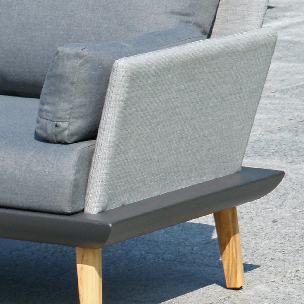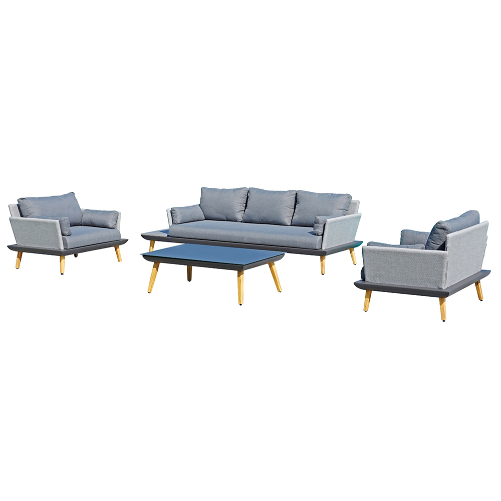 Utomhuslounge bestående av 2 fåtöljer och en 3-sits soffa utrustad med ett praktiskt sidobord med träskiva i harts klädd i