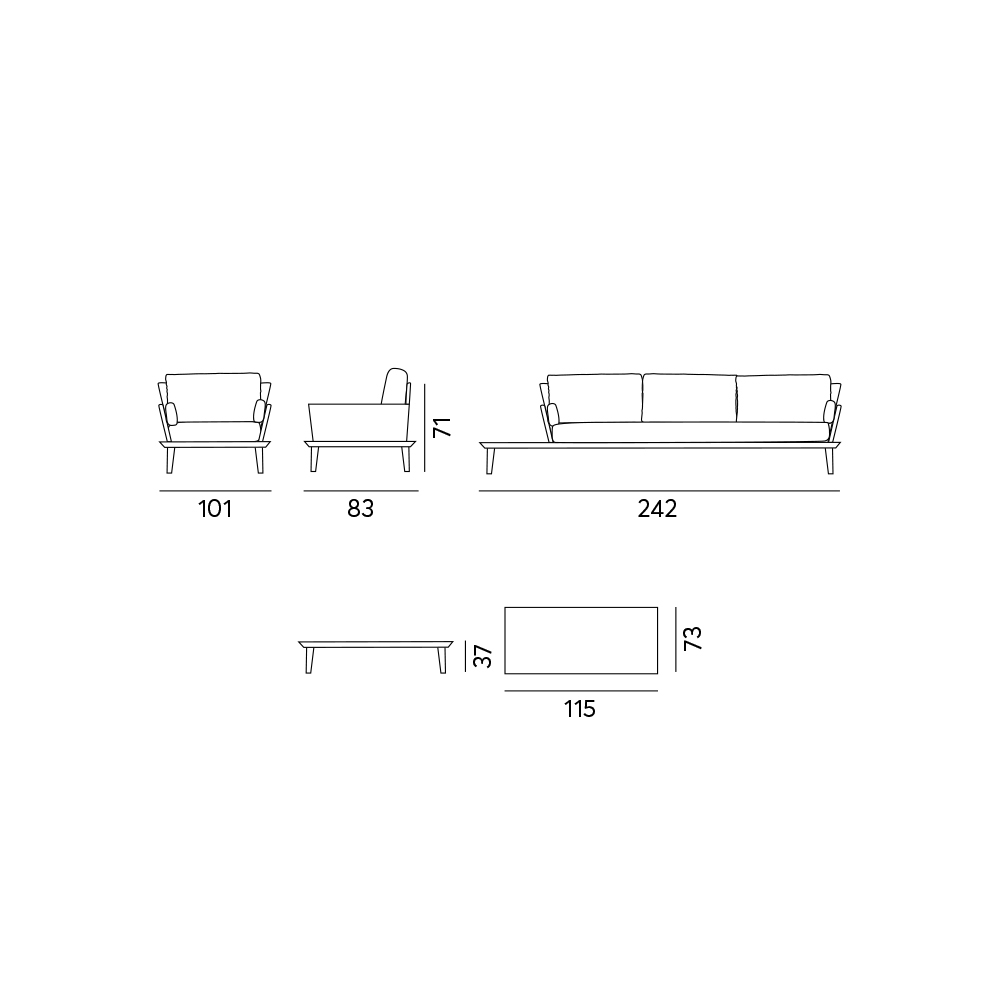 - tresitssoffa: B 242 x D 83 x H 71 cm;