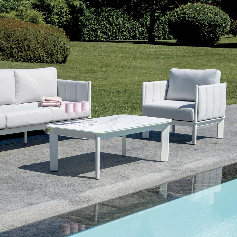 Soffbordet med marmorliknande skiva kompletterar elegant ensemblen och erbjuder en raffinerad och hållbar yta för att placera drycker, böcker eller dekorativa föremål.