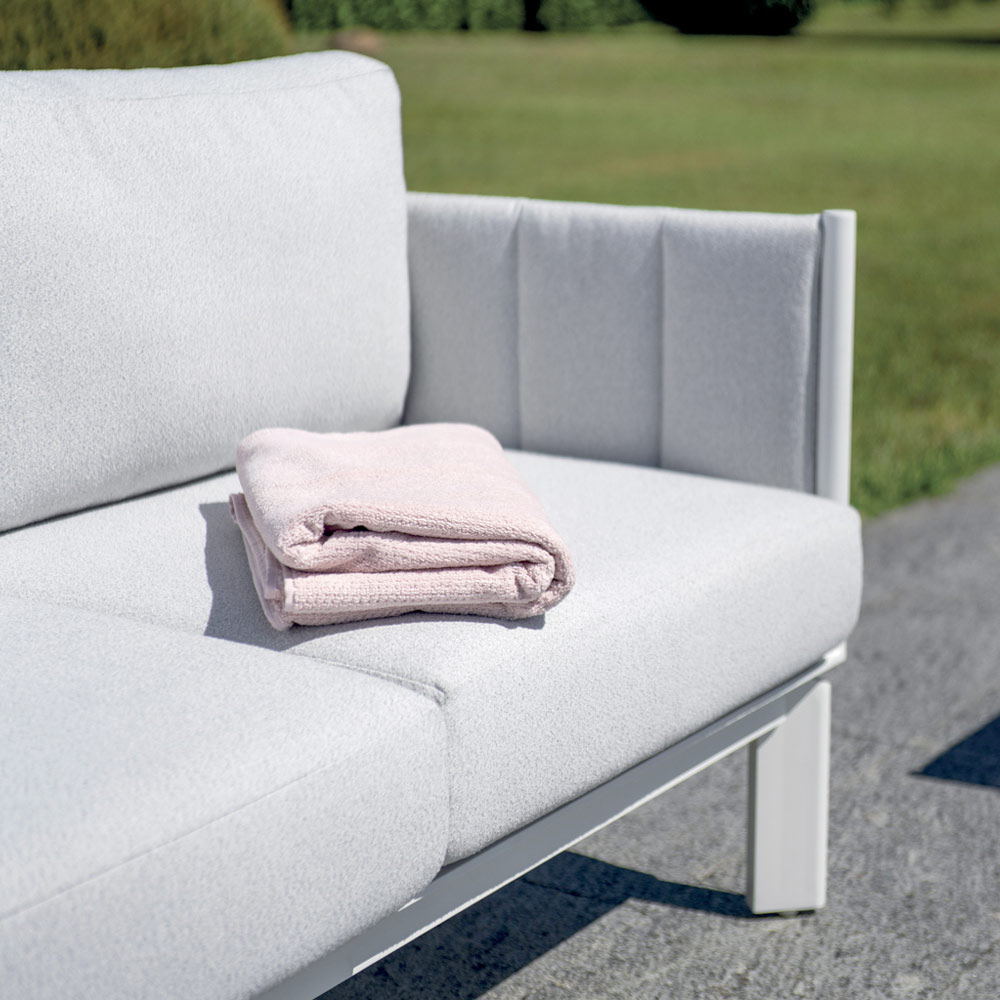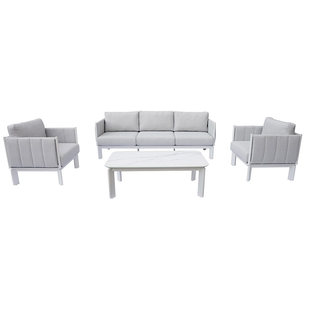 Den vita aluminiumramen ger ljusstyrka och hållbarhet, medan den ljusgrå tygstoppningen ger en touch av mjukhet och komfort. De avtagbara kuddöverdragen , också i ljusgrått, möjliggör snabbt och enkelt underhåll, vilket håller vardagsrummet alltid snyggt och oklanderligt.
