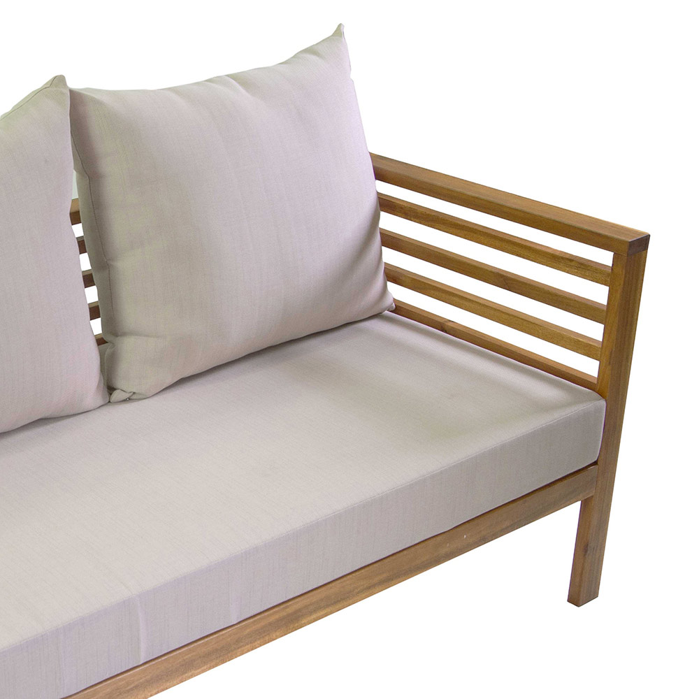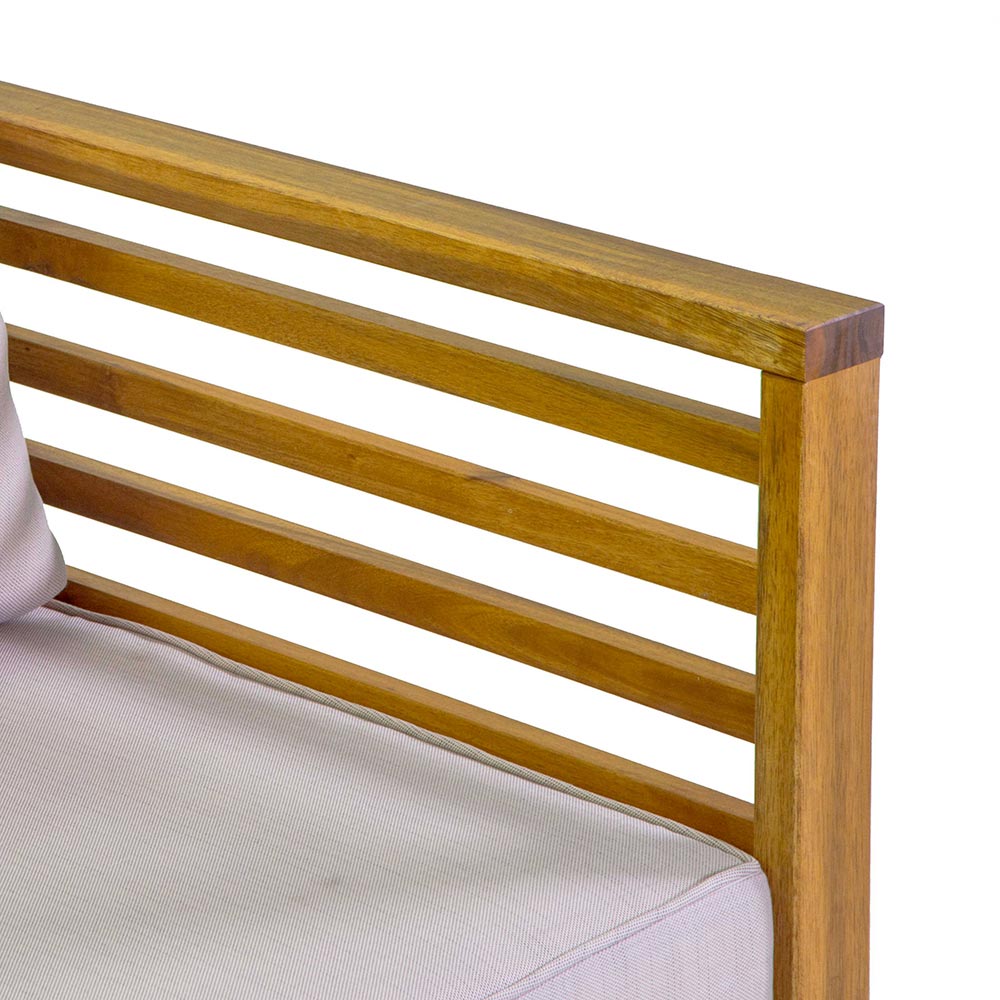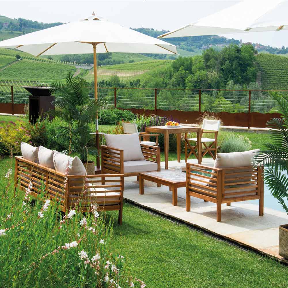 Detta loungeset i trä är perfekt för att ge en touch av naturlig elegans och komfort till ditt utomhusutrymme eller vardagsrum. Detta set består av en stor soffa, två enkla fåtöljer och ett centralt bord med en charmig keramisk kakelplatta och är perfekt för att underhålla gäster eller njuta av avkopplande stunder med familjen.