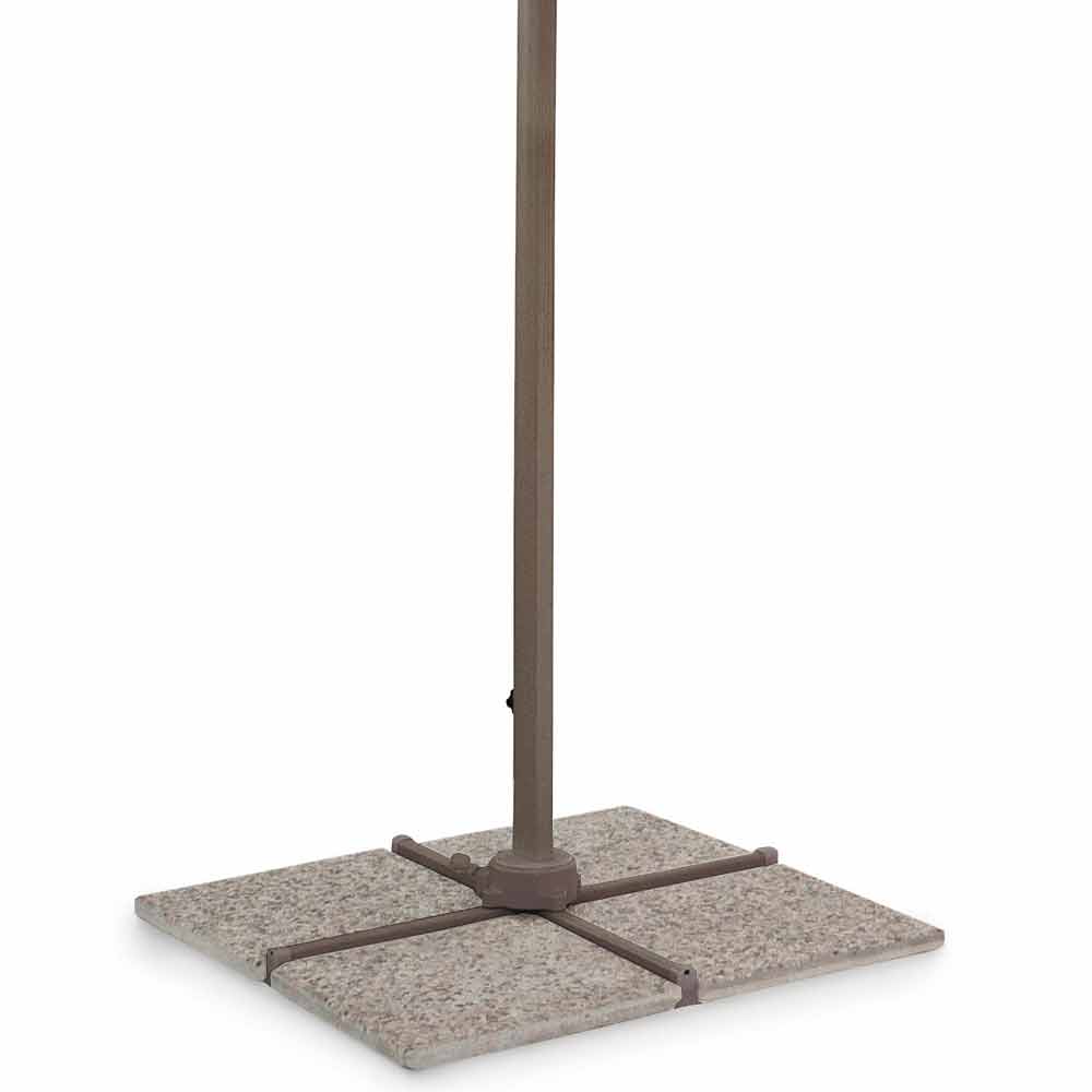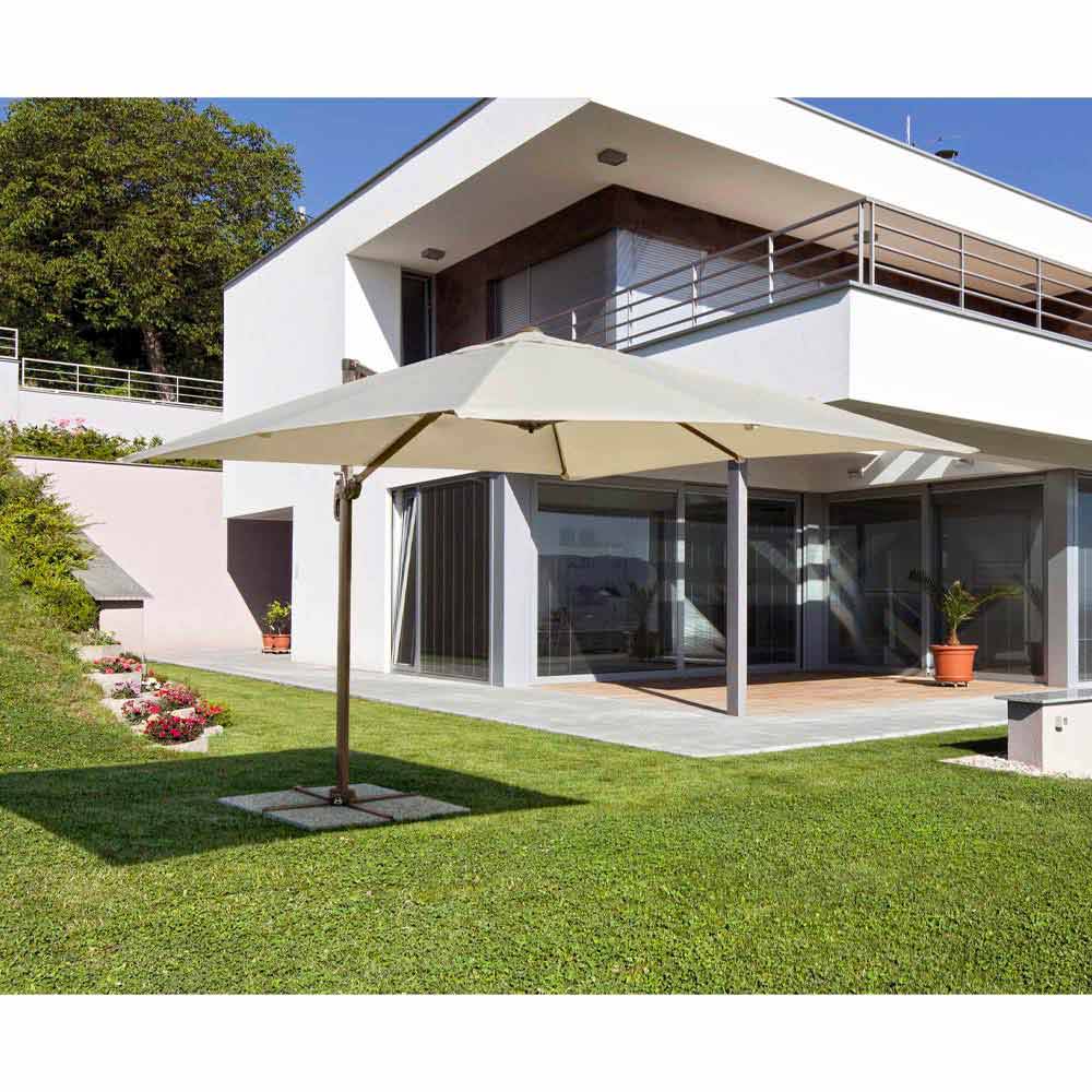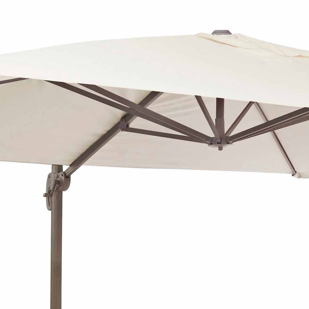 Pulverlackerad aluminiumstruktur (polyester). 53x77mm stolpe, 25x40mm upphängd stolpe, 8 14x24mm ribbor. Naturligt polyestertyg 200gr / m2 med pa (polyamid) beläggning. Tvärfot i stål . Manuellt vridbar 360 ° stolpe.