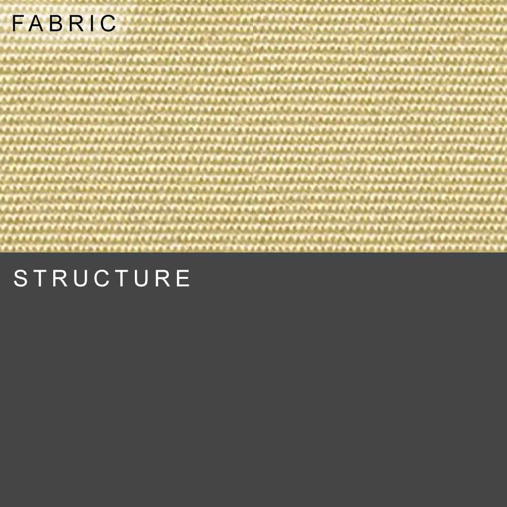 akryltyg och pulverlackerad metall, Ø60 mm aluminiumrörsstång, snabbkopplade aluminiumribbor dekorerade med spår, PE-plastlock, nylonkrage, krona och spets. Den teleskopiska centrala polkonstruktionen har en remskivans öppnings- / stängningsmekanism och är utrustad med ett flätat rep (100% polyester) och en linrulle för låsning.