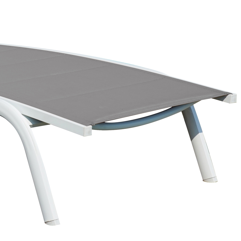 Stapelbar utomhusschäslong med sits i textilen och aluminiumstruktur.