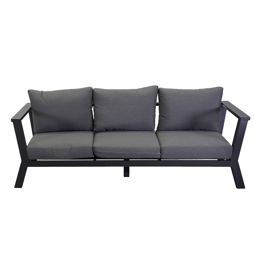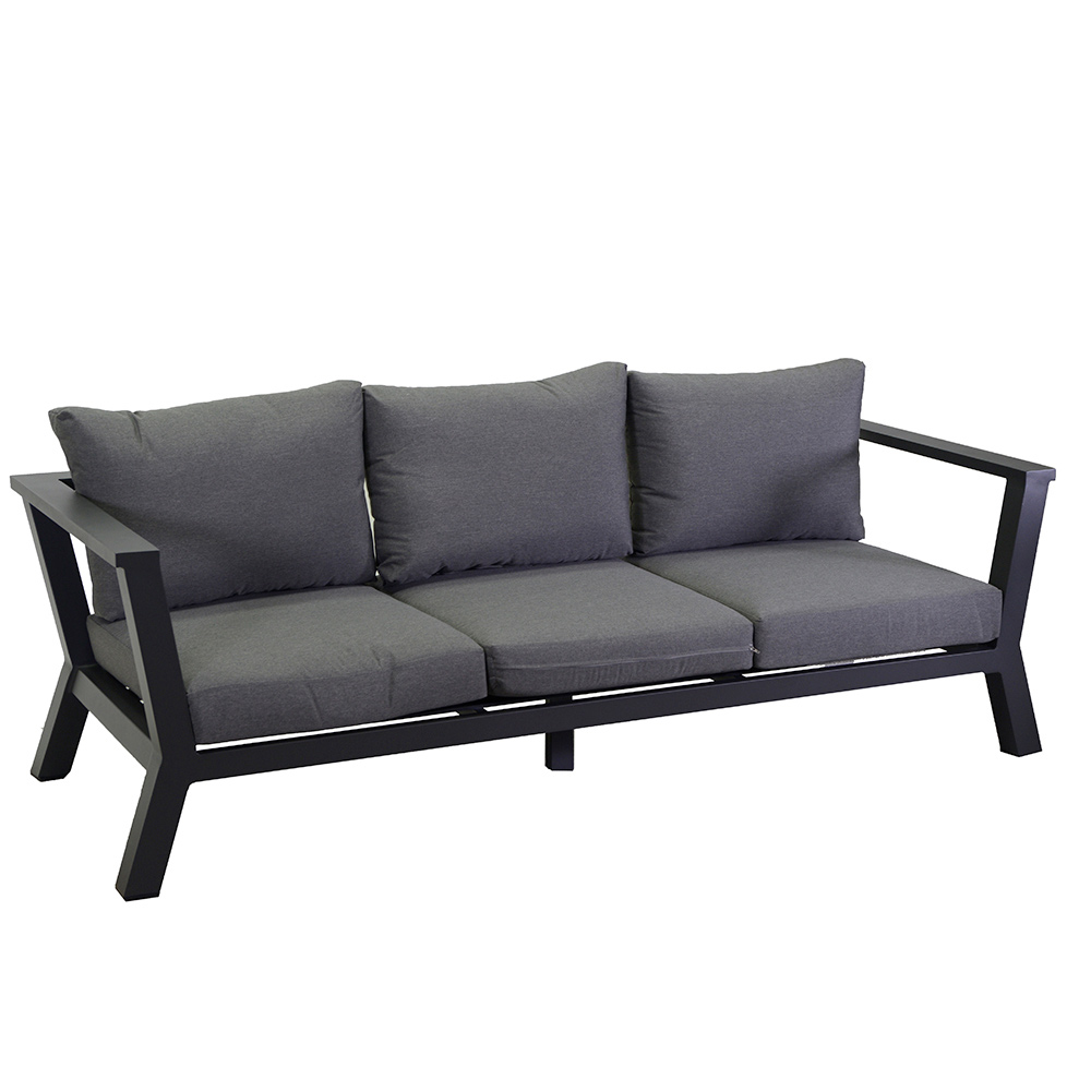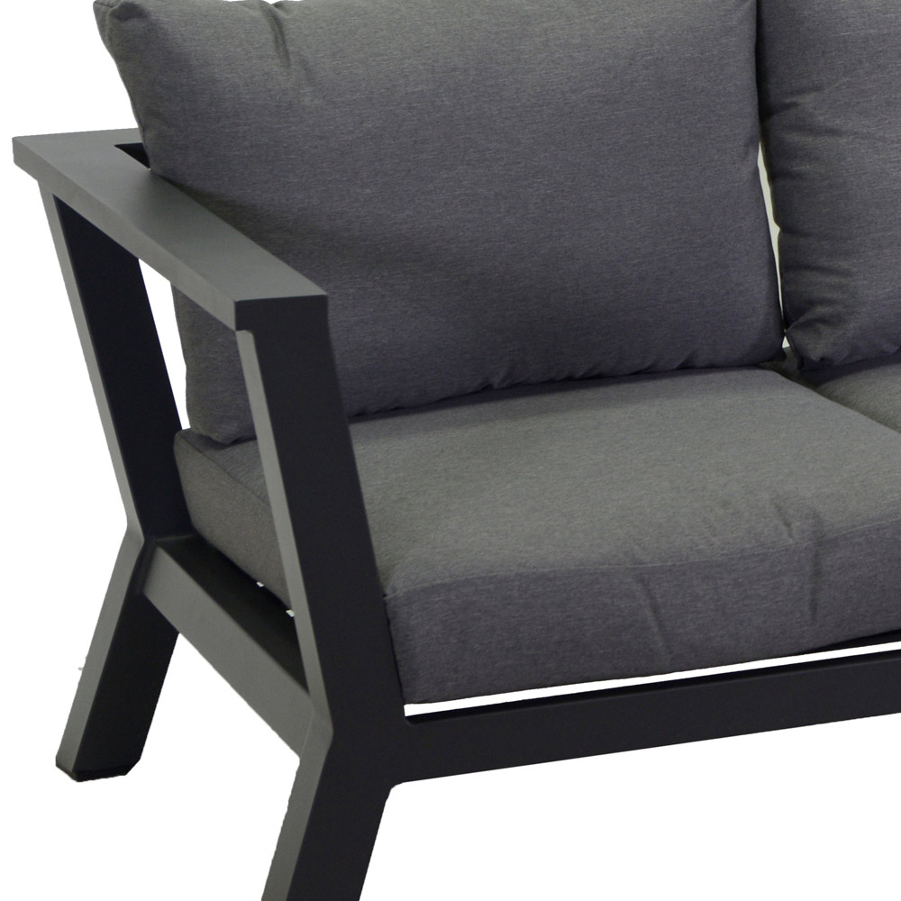 Den här soffan med antracit pulverlackerad aluminiumram är symbolen för modern elegans och funktionalitet. Den är perfekt för alla utomhusmiljöer och har en rymlig och bekväm sittplats med dynor i grått tyg som ger maximal komfort. Dessa dynor, förutom att vara estetiskt tilltalande, är vattenavvisande och avtagbara, vilket garanterar enkelt underhåll och lång livslängd.