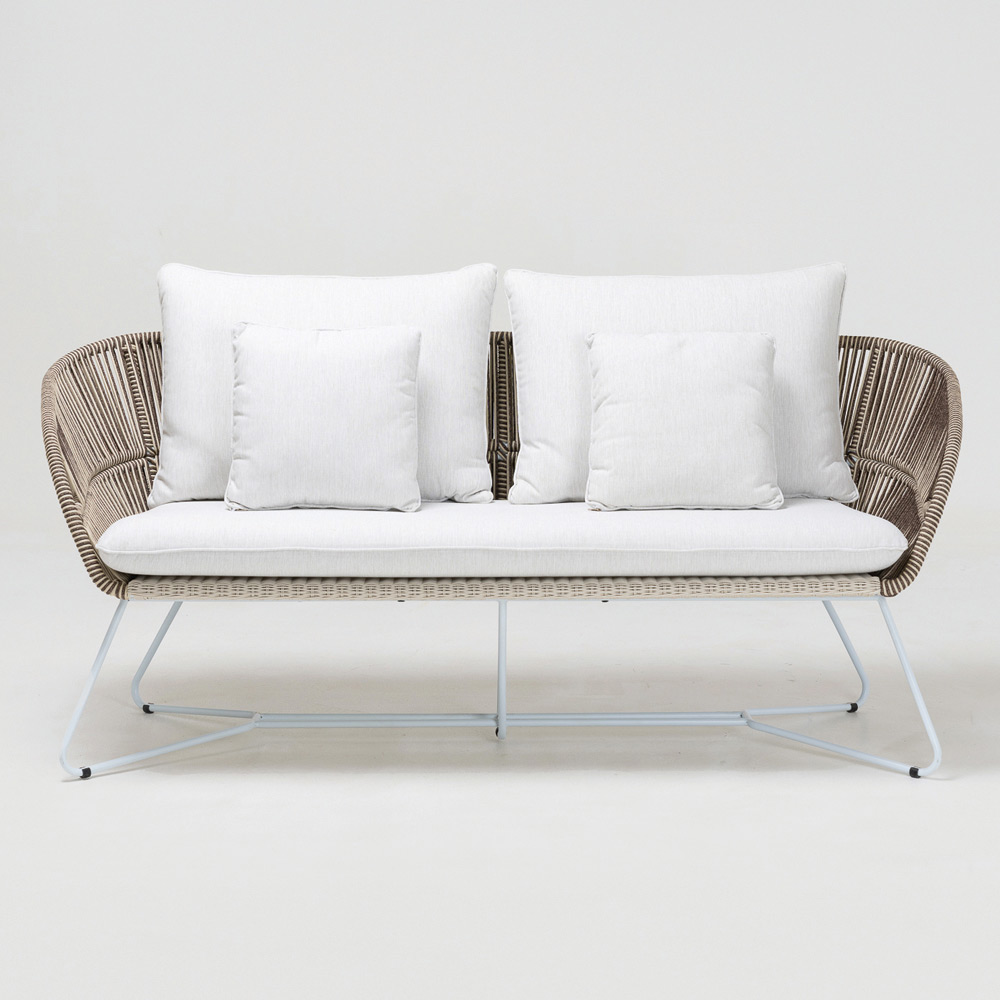 Olefin/PP ROPE väv med en tvåfärgad pärlvit och cappuccino finish och sittdyna och 2 ryggkuddar i utomhus