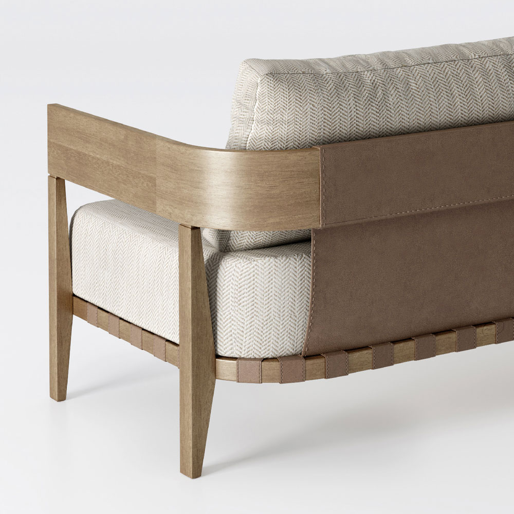 sliten struktur i teak. Soffan är utsmyckad i sitsstrukturen och i ryggstödet med