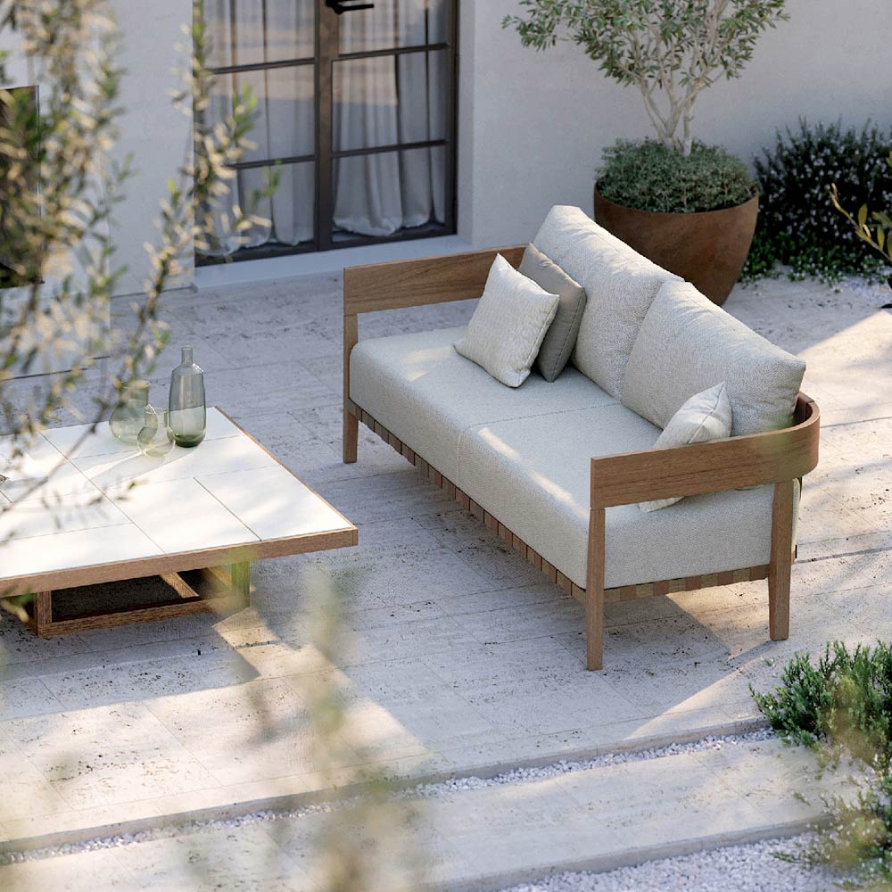 Trädgårdssoffa i teak med vadderad sits och ryggstöd Tillverkad i Italien