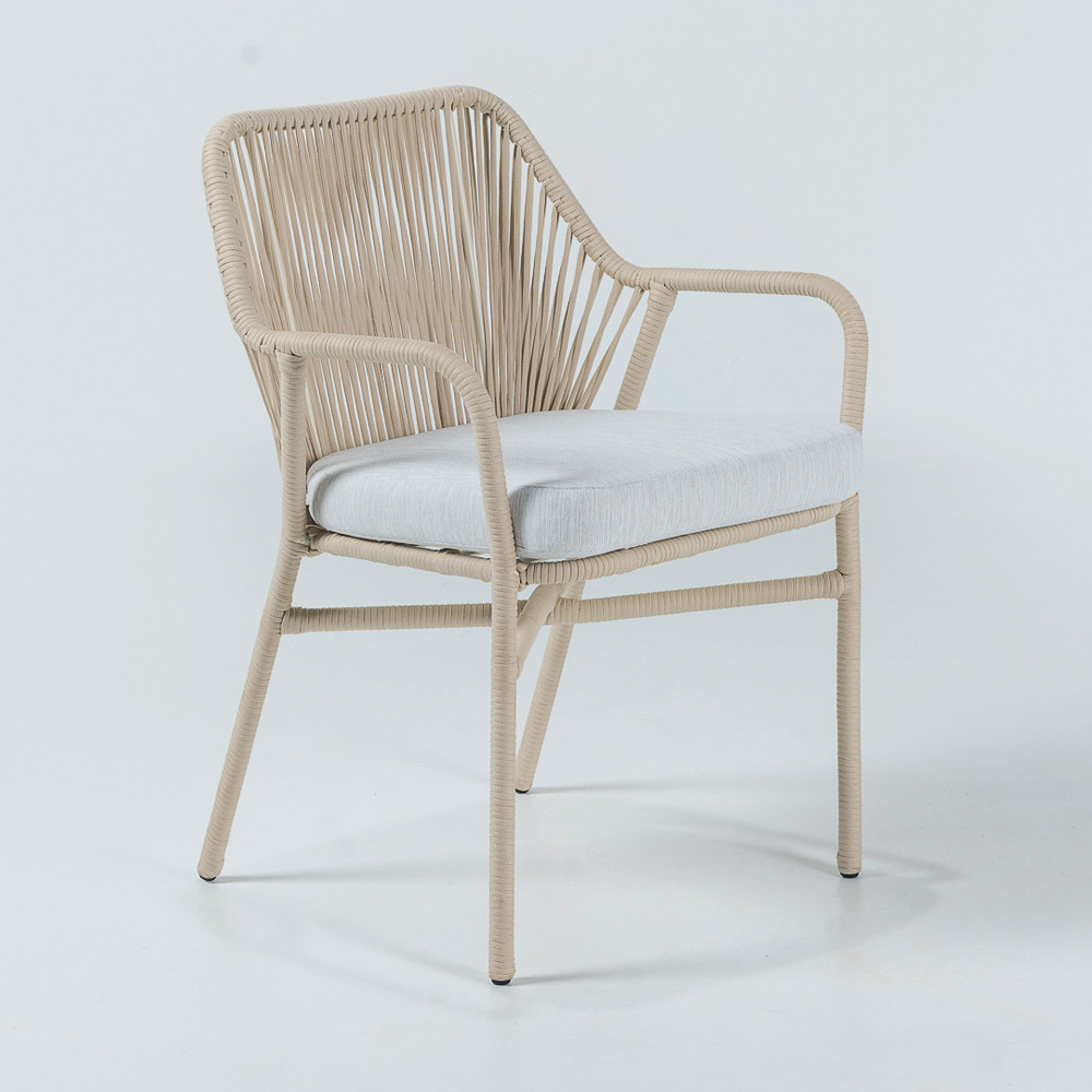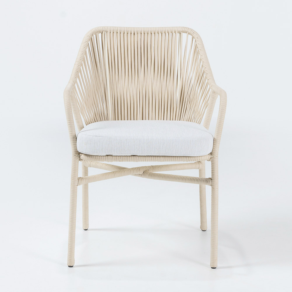 Utomhusfåtölj tillverkad med aluminiumstomme, Olefin/PP ROPE-väv och sittdyna i olefin i seriens färg "off white".