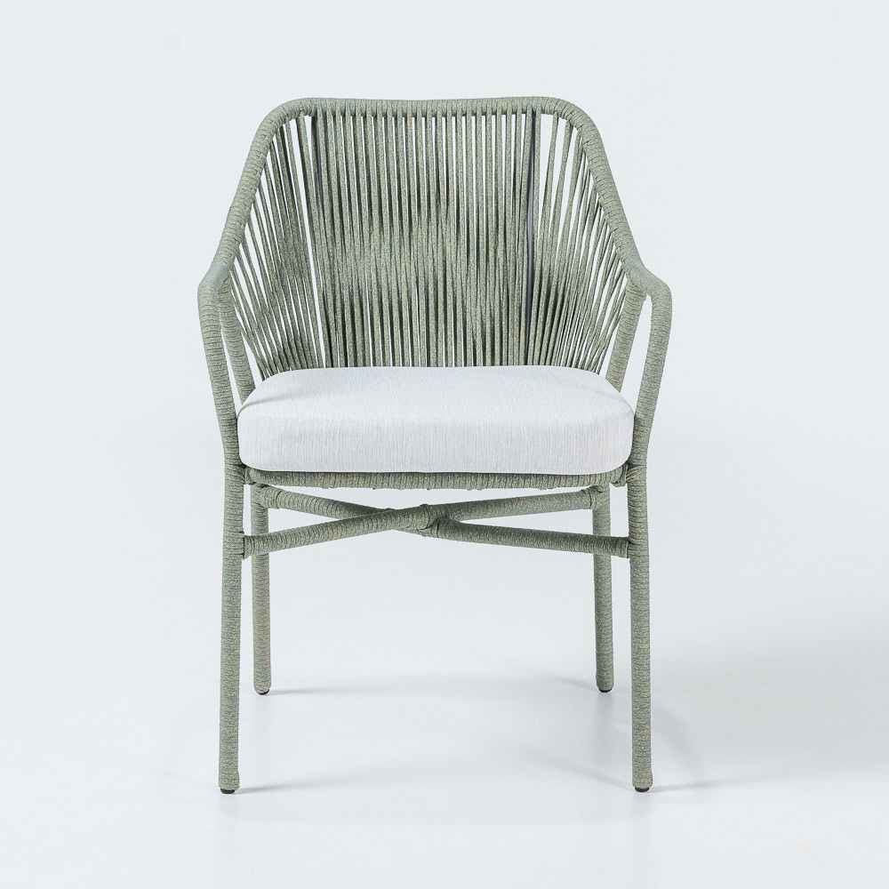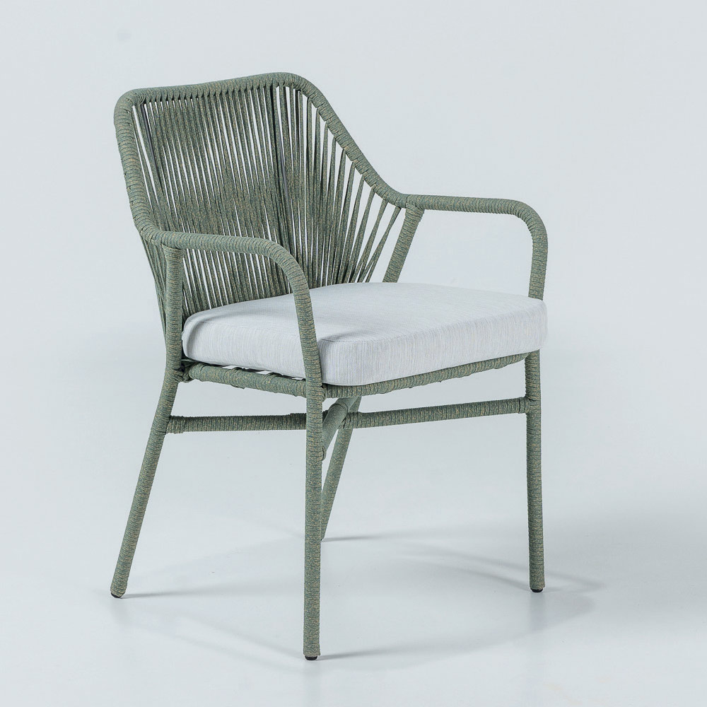 Denna trädgårdsfåtölj är en oas av avkoppling, perfekt för att njuta av lugnet i utomhusutrymmen. Dess design är modern, med en lätt struktur i vävt rep som skapar ett spel av transparens och skuggor, vilket ger djup och visuellt intresse till din trädgård eller terrass.