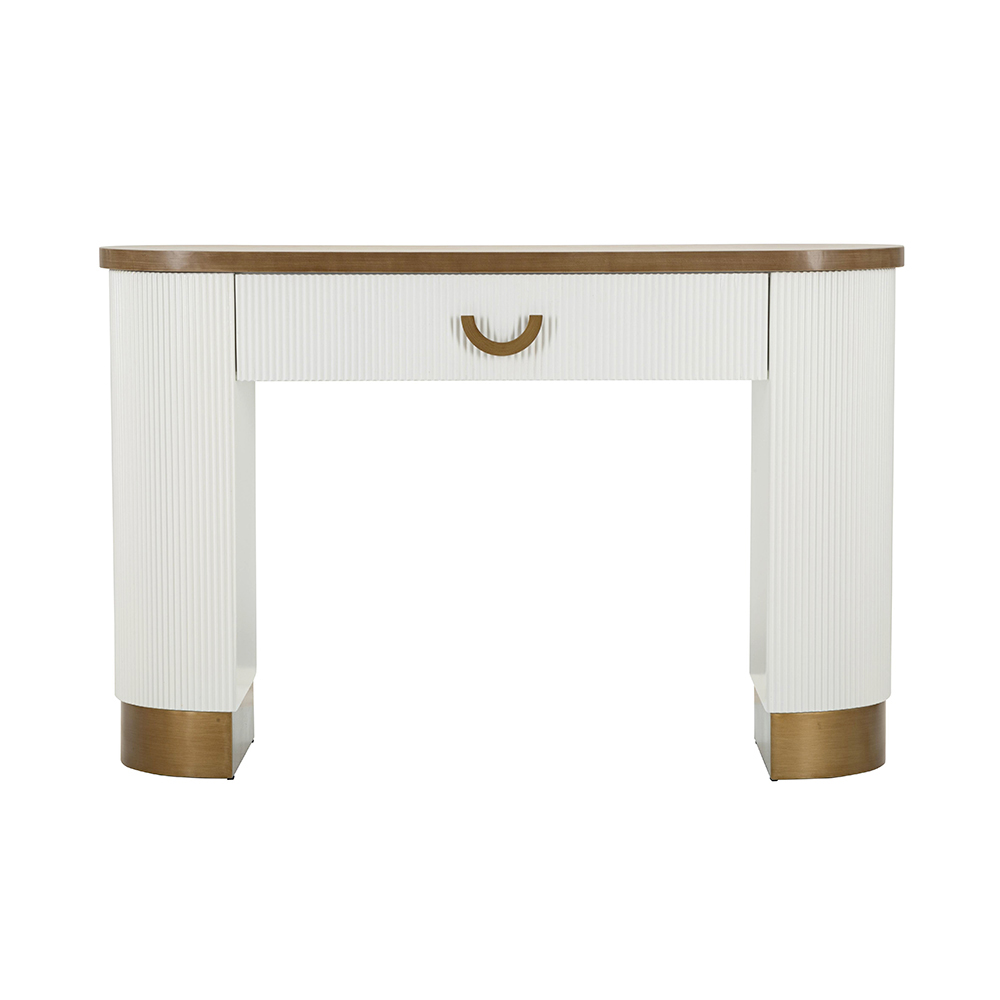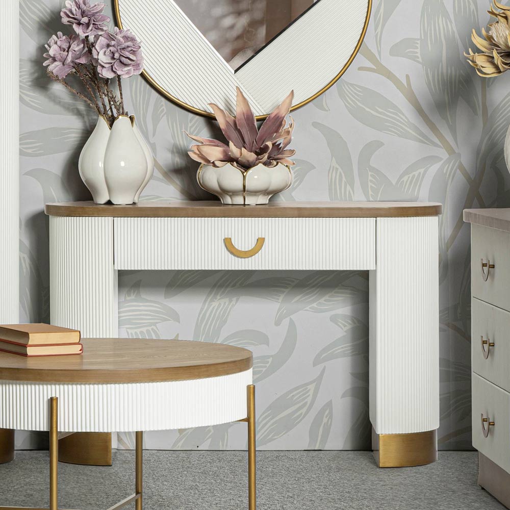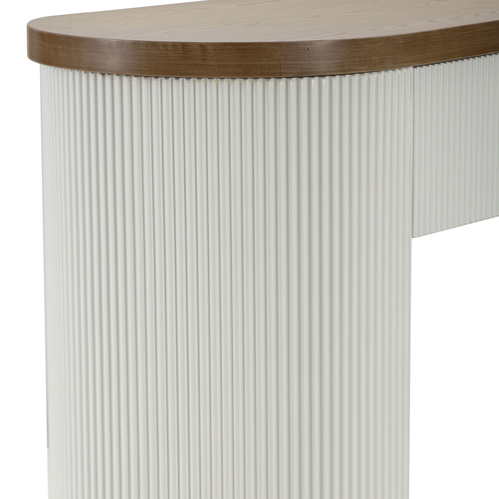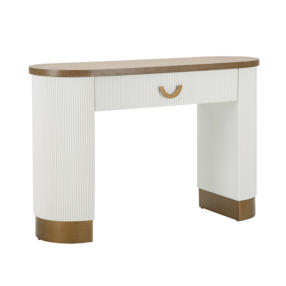 Denna halvcirkelformade konsol representerar en förtrollande blandning av modern design och klassiska detaljer. Den eleganta strukturen, med sina rena linjer och varmtonade MDF-ytor, kontrasterar harmoniskt med mjukheten i de vertikala spåren som pryder sidopanelerna, vilket ger en rik visuell upplevelse och en fängslande textur.