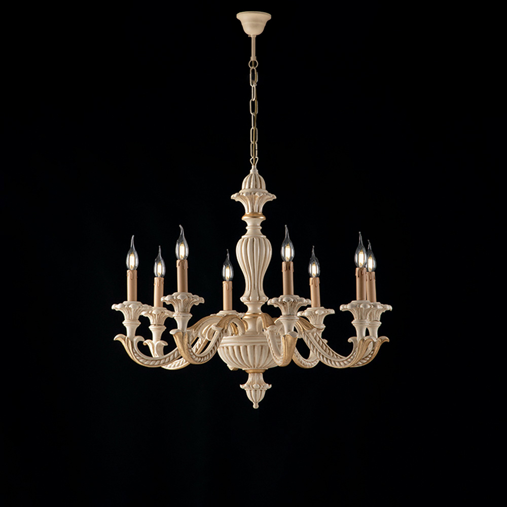 Denna klassiska träkrona är ett autentiskt uttryck för italiensk hantverkselegans och ett sant dekorativt mästerverk som kan förvandla ljus till ett verkligt fängslande inredningselement. Den fint utformade strukturen, med slingrande armar och svarvade detaljer , påminner om den traditionella stilen hos vintagekronor, omtolkad med förfinad smak.