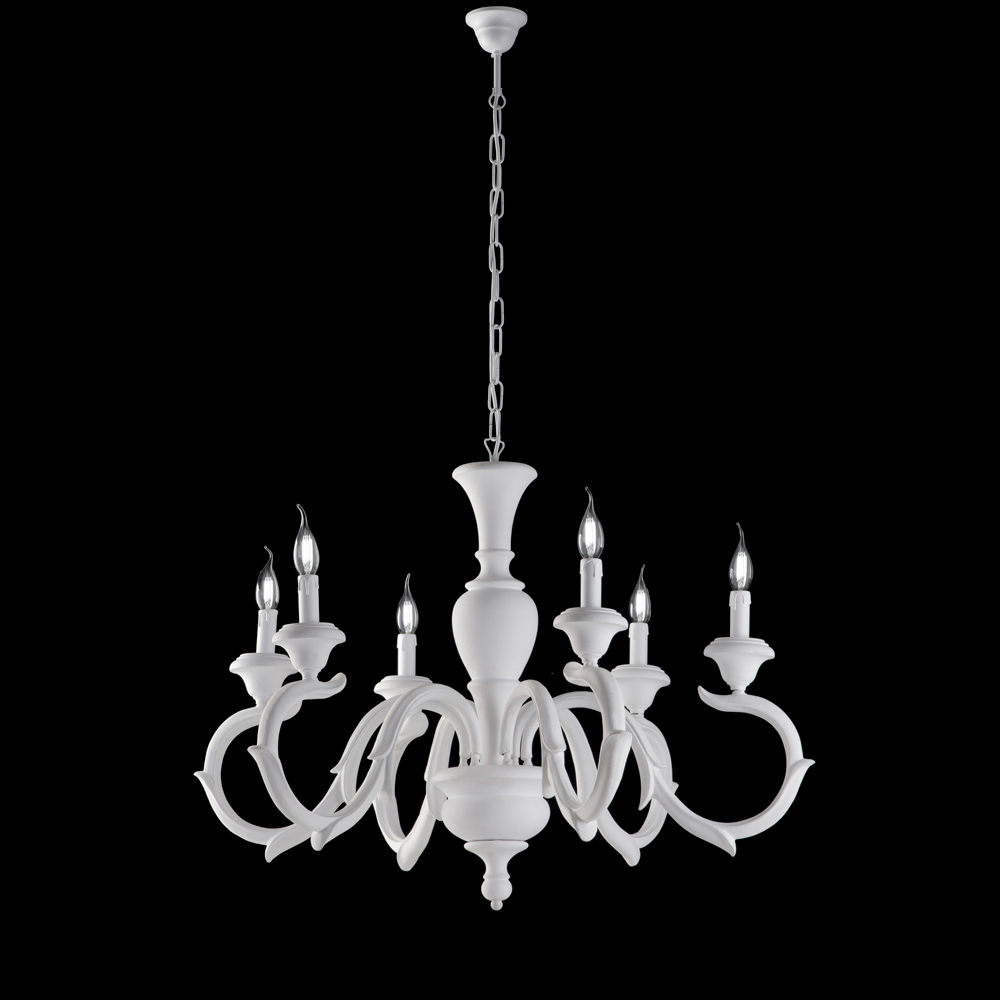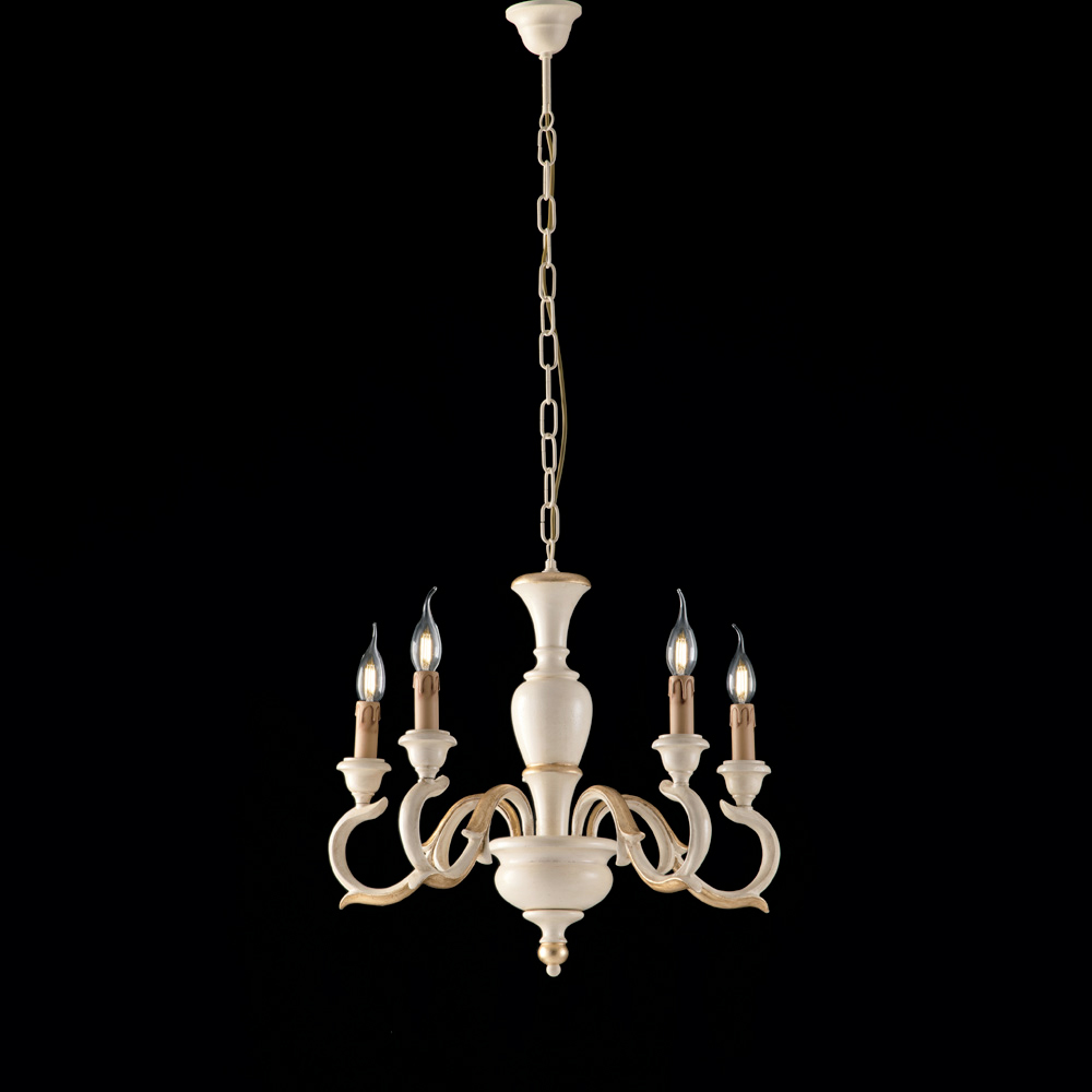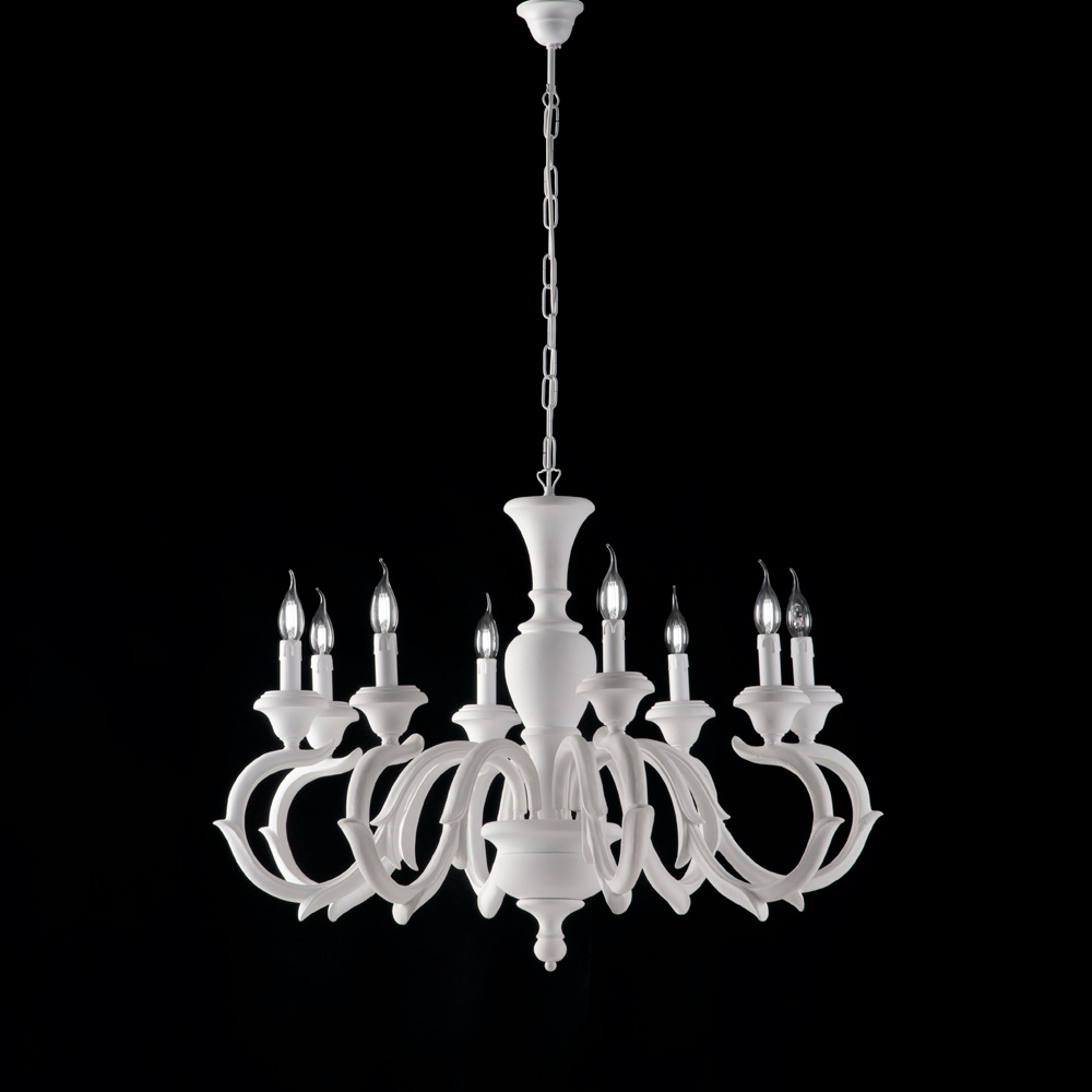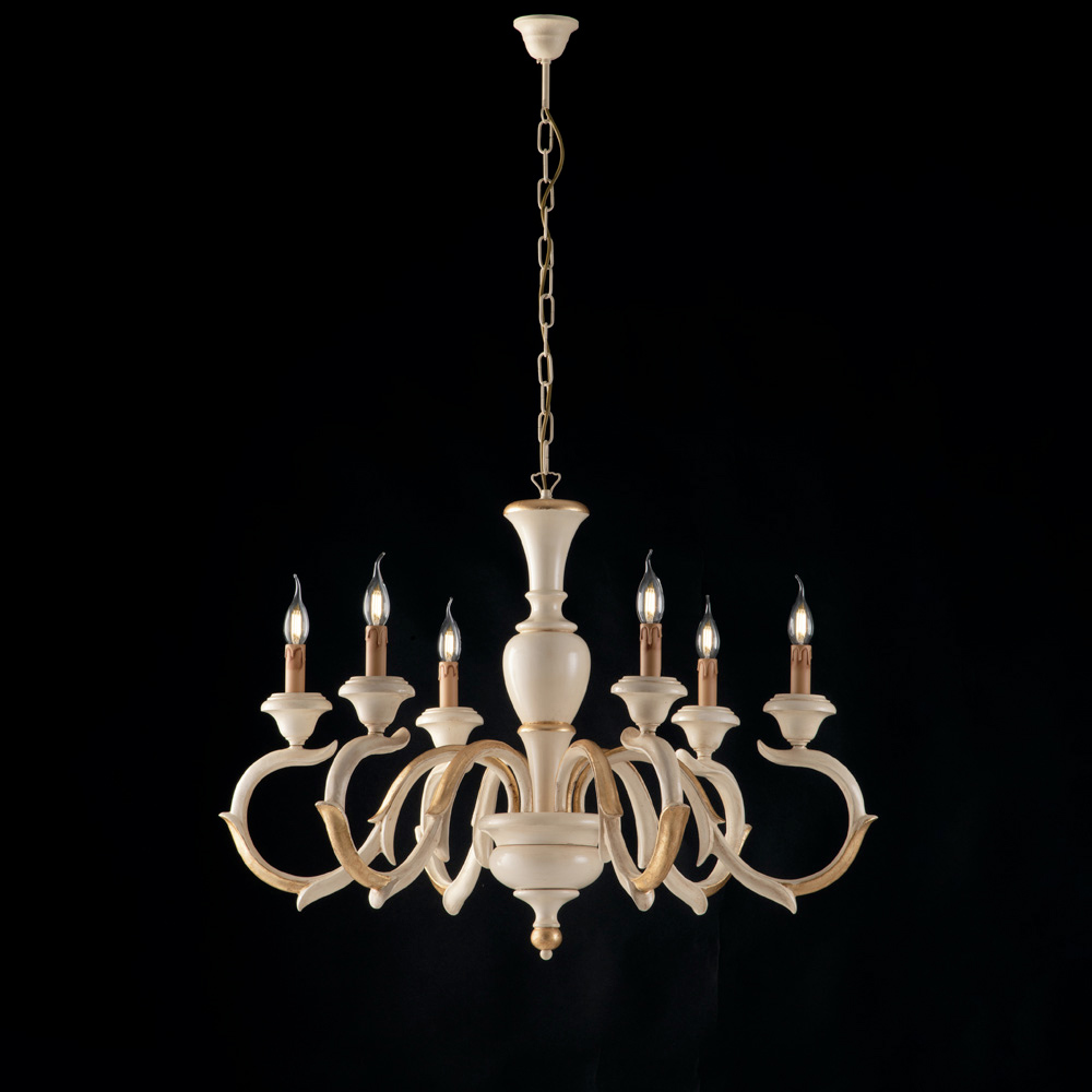 Tidlös elegans och skickligt hantverk möts i denna klassiska träkrona, tillverkad i Italien , utformad med omsorg och noggrannhet för detaljer. Den harmoniska strukturen, som kännetecknas av slingrande armar i traditionell stil , ger rummet en dramatisk och raffinerad elegans.
