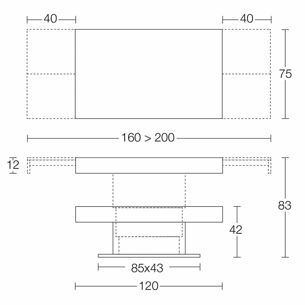 Toppen är utdragbar med två sidoförlängningsskivor på 40cm vardera (invändigt).